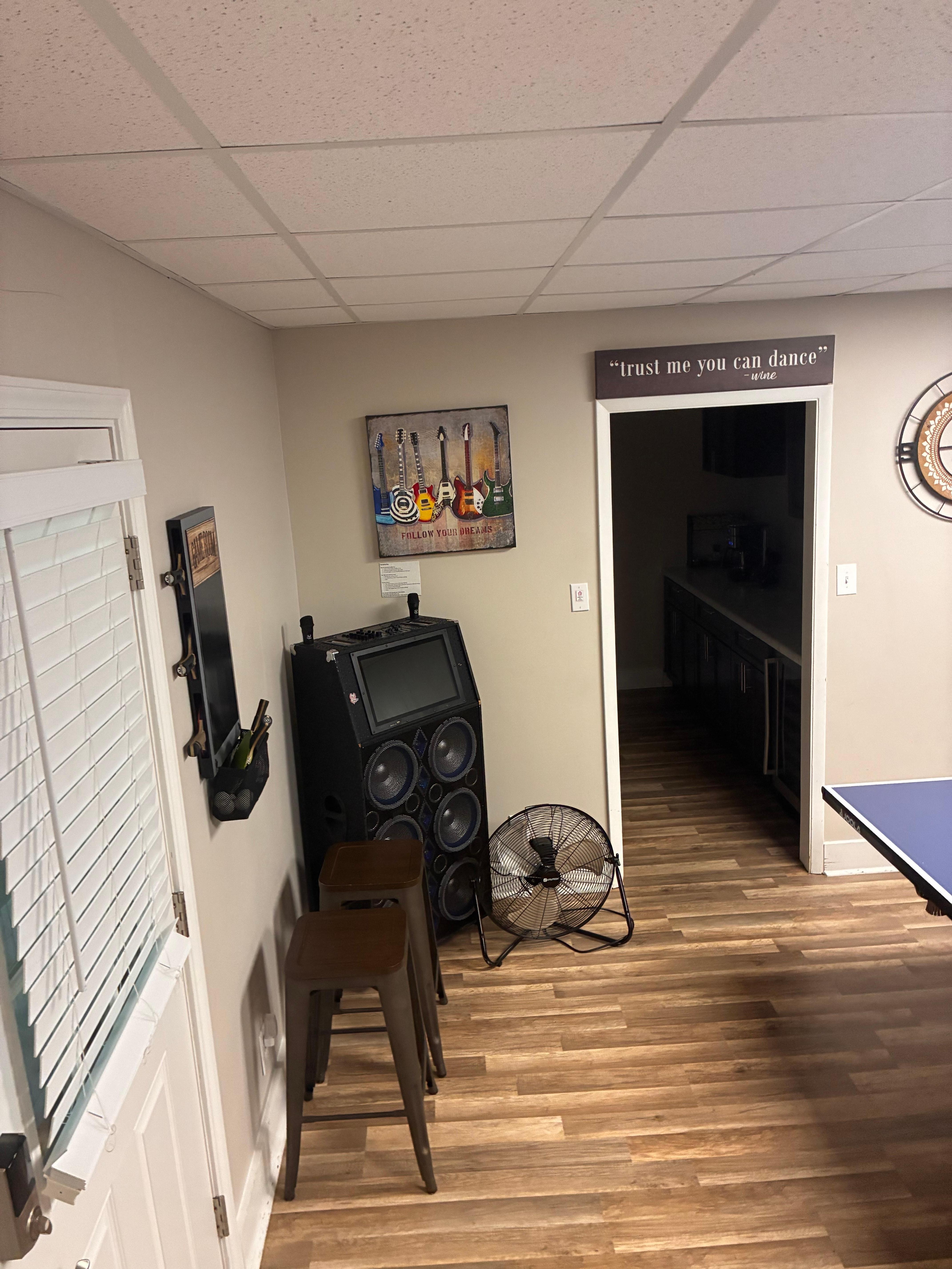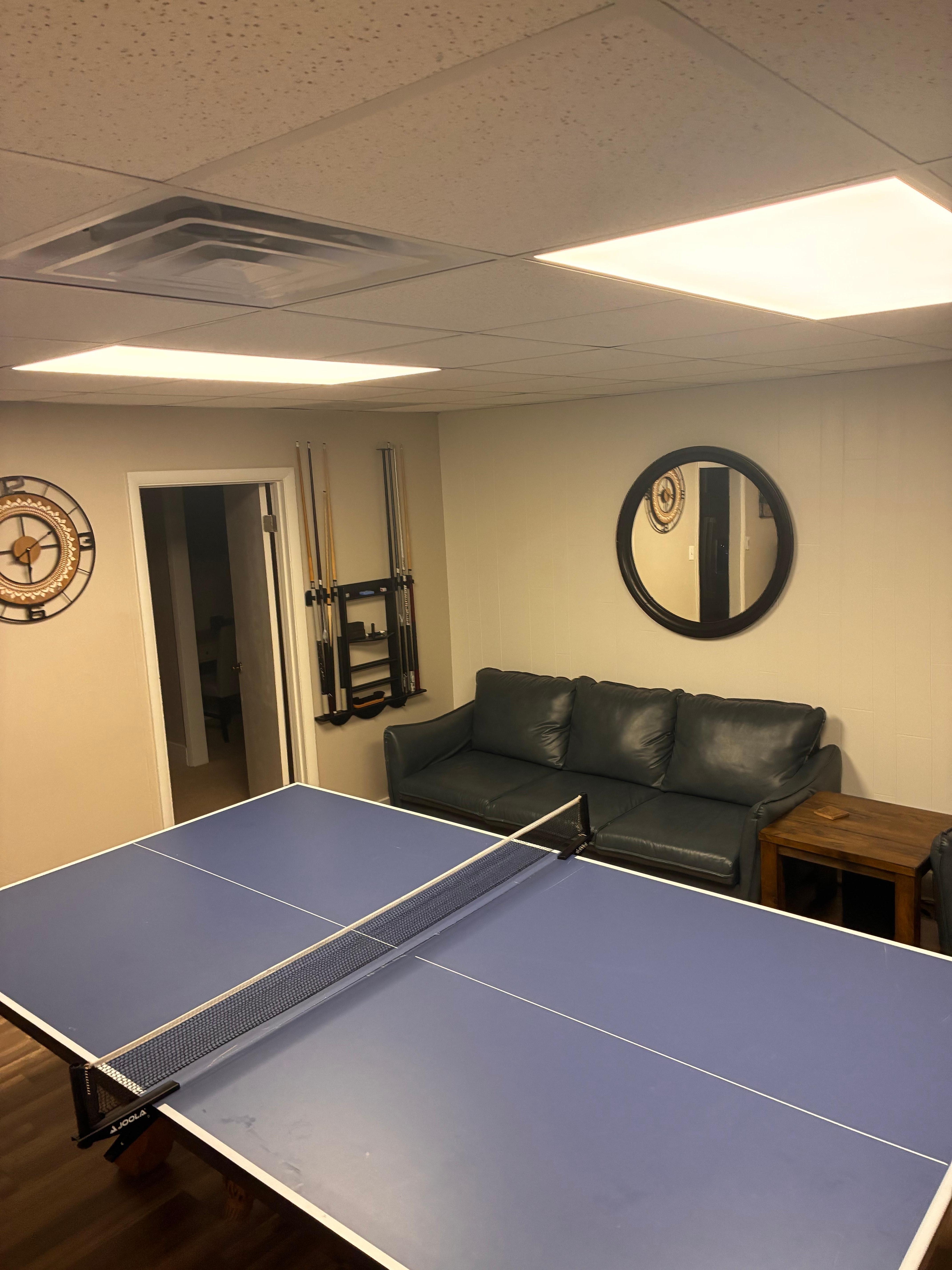 Living area with Pool table and Ping Pong table top, 85 inch smart TV, Bluetooth sound system with Karaoke, kitchenette with wine cooler.