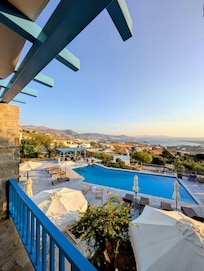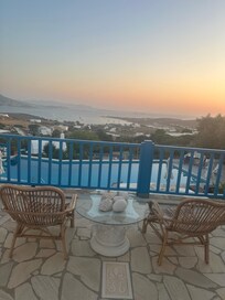 The view!!!!! By the swimming pool, when you are in the balcony having breakfast, when you have a dinner with traditional seafood and a glass of wine or ouzo, when you see the sunset, when you see the boats coming and leaving the island and you are still there enjoying your relaxation, then you realize that it was the best choice of choosing this point of the island to enjoy your vacations!!!!!