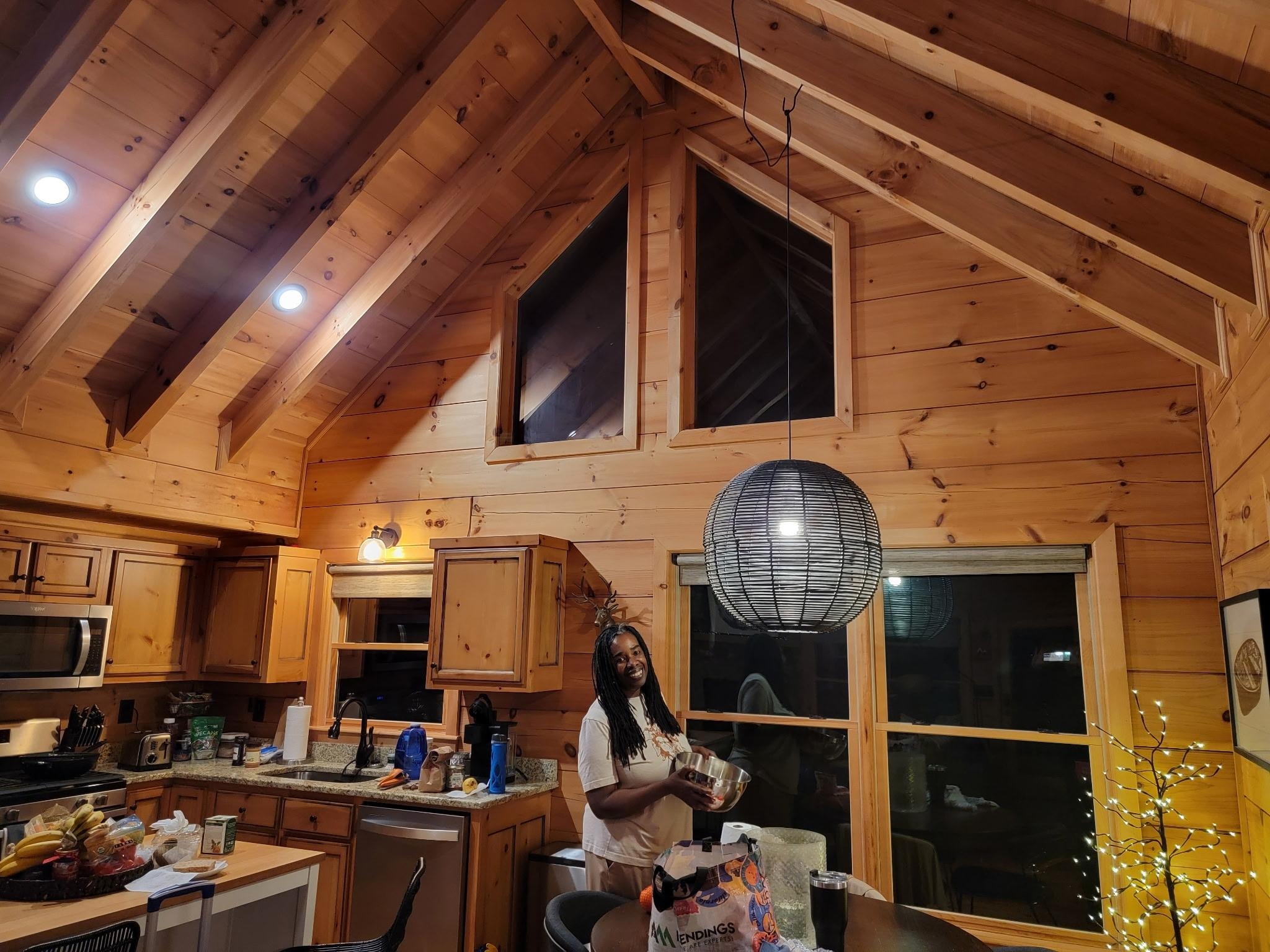 The cabin was something out of a magazine. Every inch had beautiful craftsmanship and cozy details. It wasn't really cold but we did use the fireplace in the evening time. We enjoyed the games and dining room table to eat and handout with our friends. The kitchen had everything you will need to cook breakfast, lunch or dinner. The rooms were comfortable and inviting. They even have extra throw blankets for sitting on the deck or laying in the swinging bed downstairs. We can't wait to enjoy another weekend relaxing here. Book the cabin, you will not be disappointed.