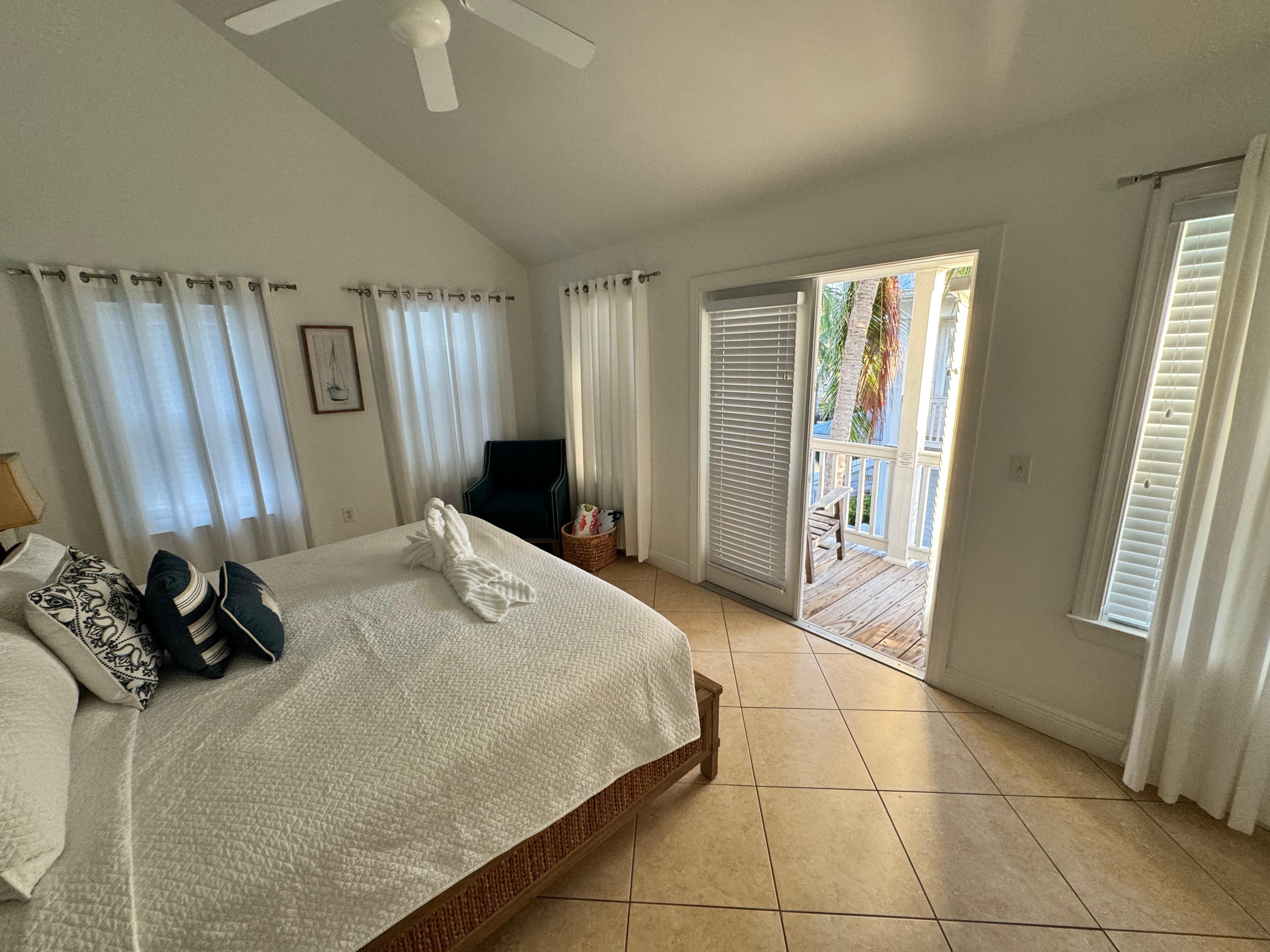 Upstairs features a calm color scheme and comfortable bed linens. Master suite offers a king size bed, private bath, flat screen TV and a romantic private balcony.