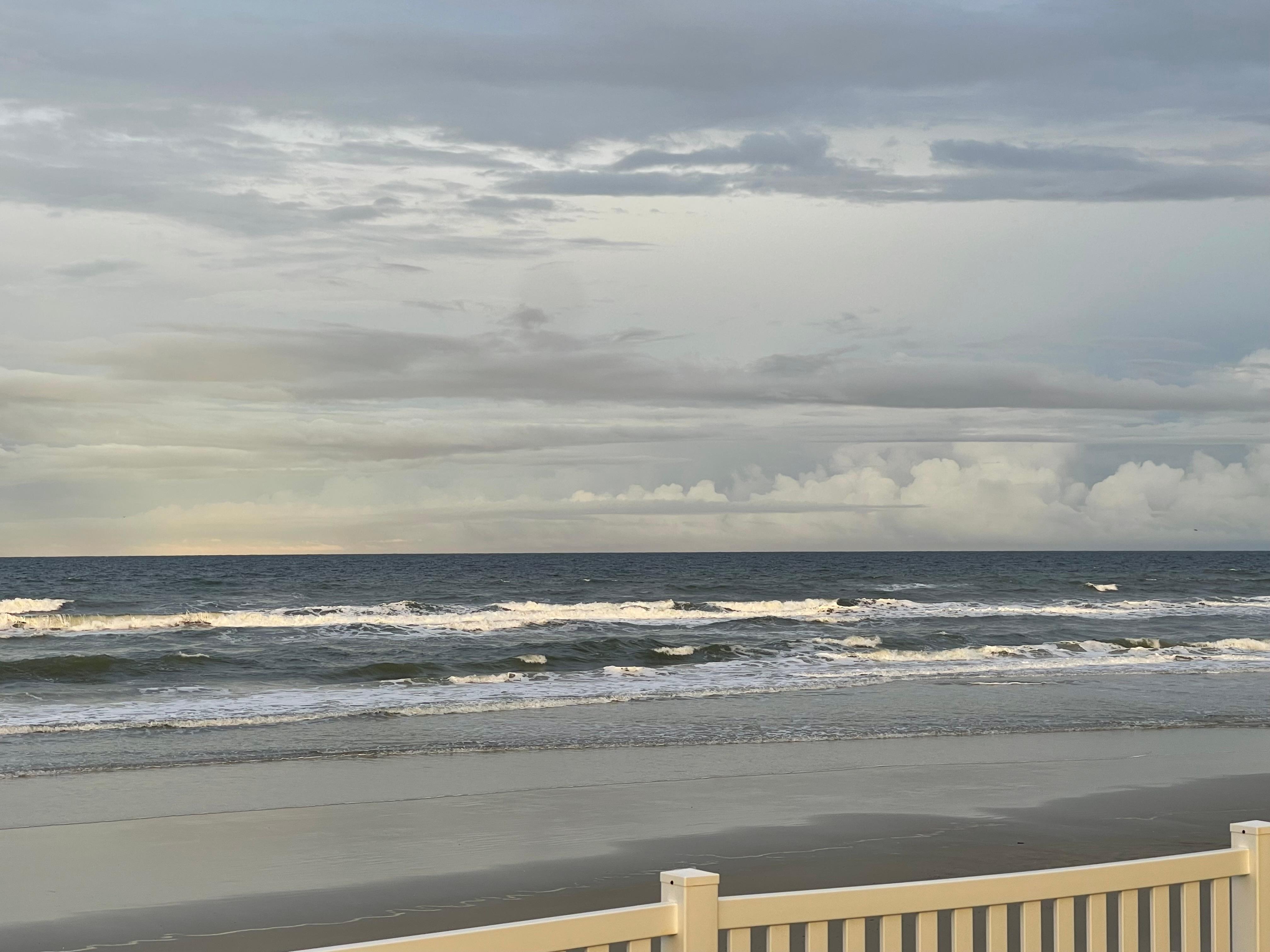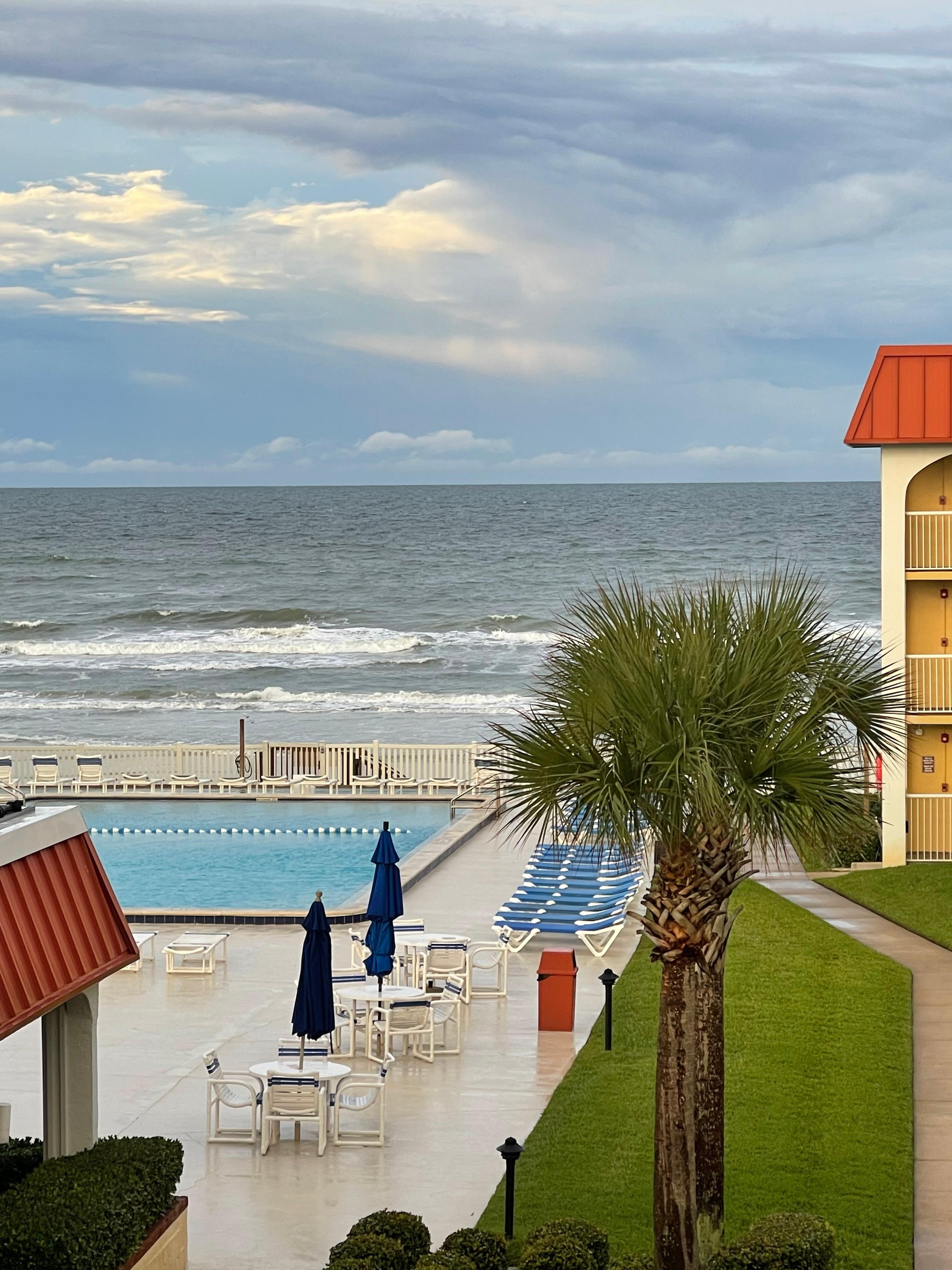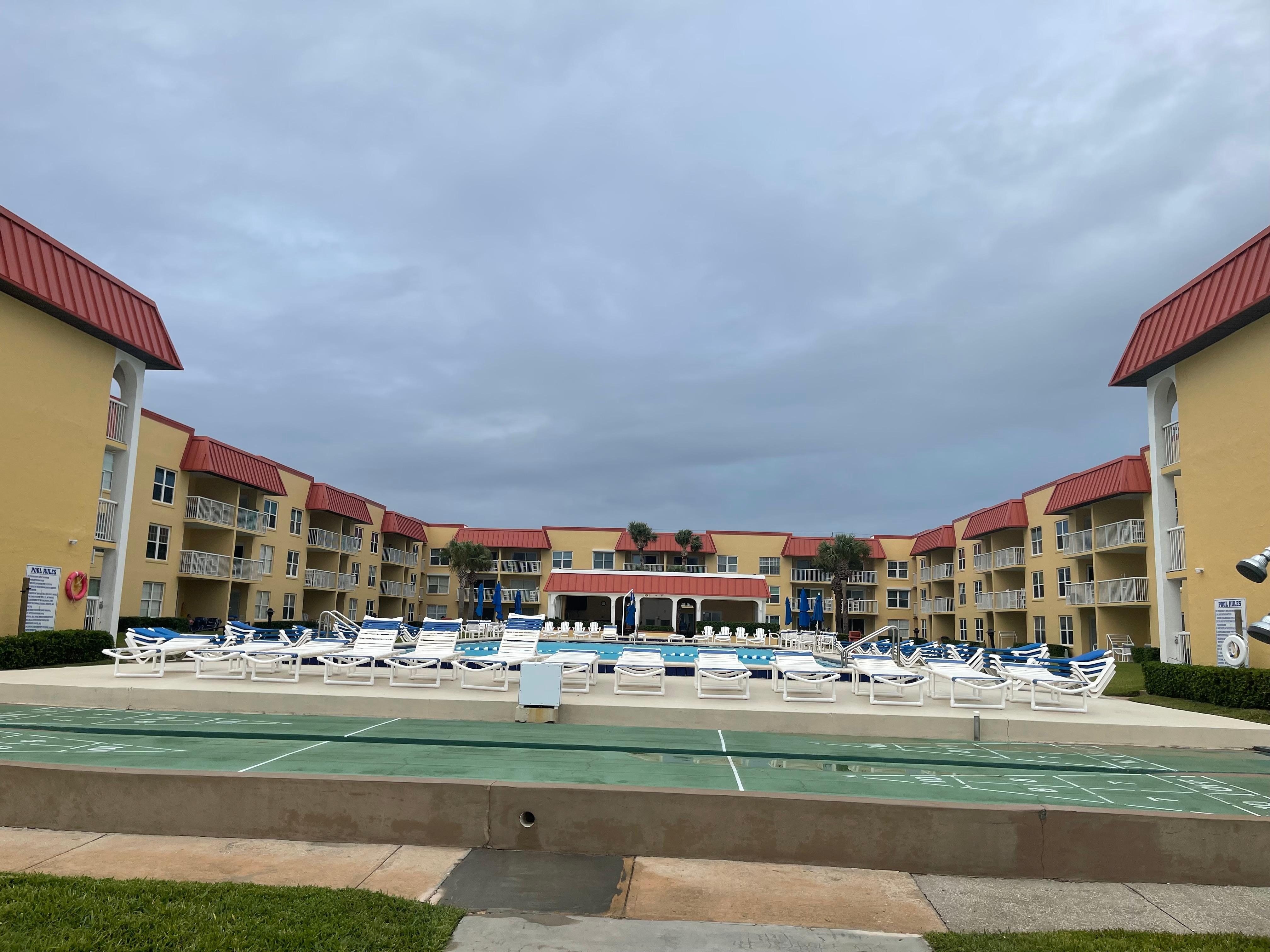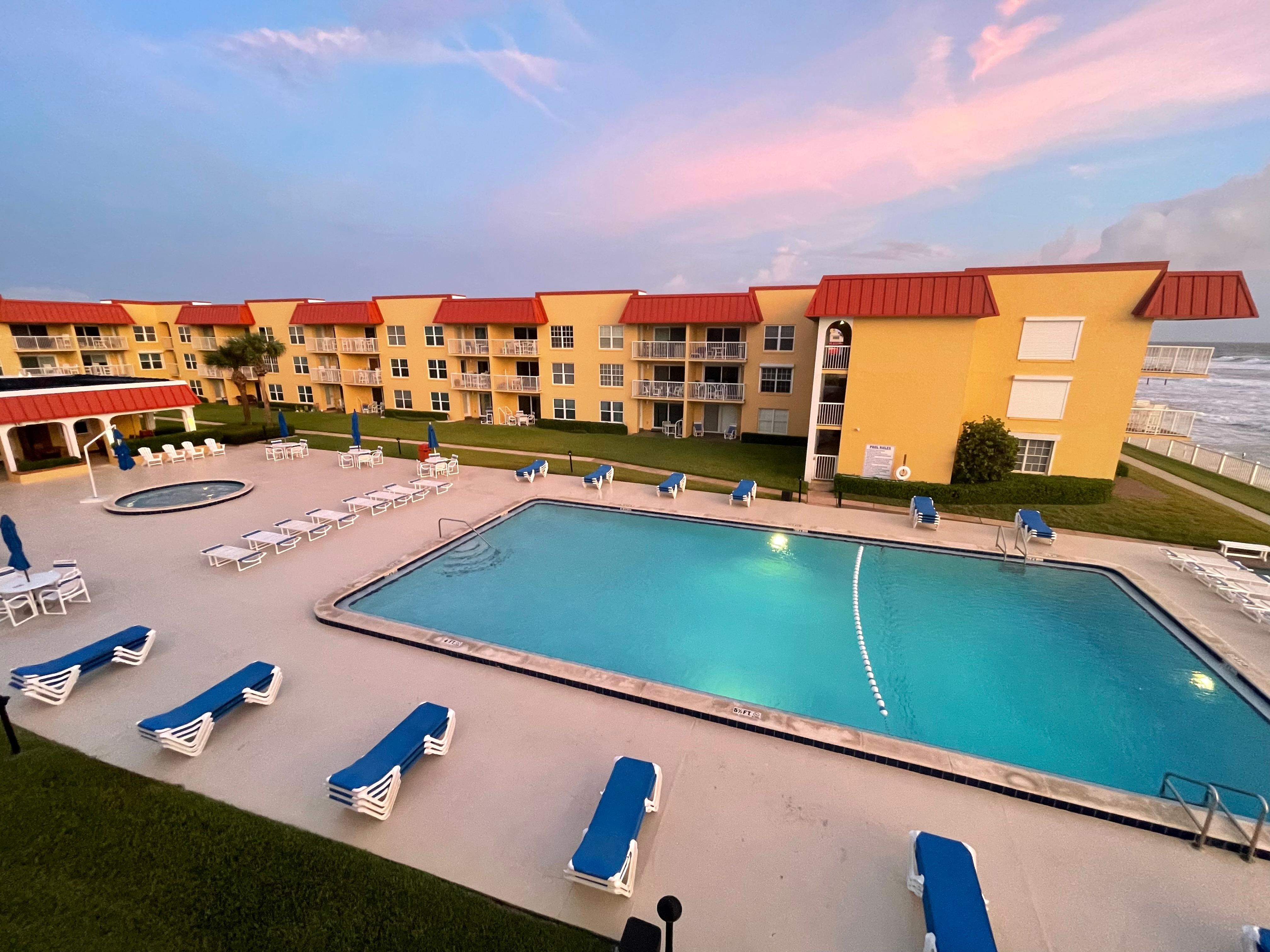 Beautiful Ocean Front condo! 3rd floor unit (so there is nobody above you) with amazing views of the Ocean, NASA Launches, courtyard, and Heated Pool (seasonally). ENTIRE PROPERTY (including parking lot) is non-smoking. main bedroom has an Ocean view, adjustable king size bed, in-suite full bath and private door to balcony. Second bedroom has a queen size bed with twin trundle. Foyer closet has 2 shade umbrellas, beach towels, 4 sand chairs, sand toys and kites.