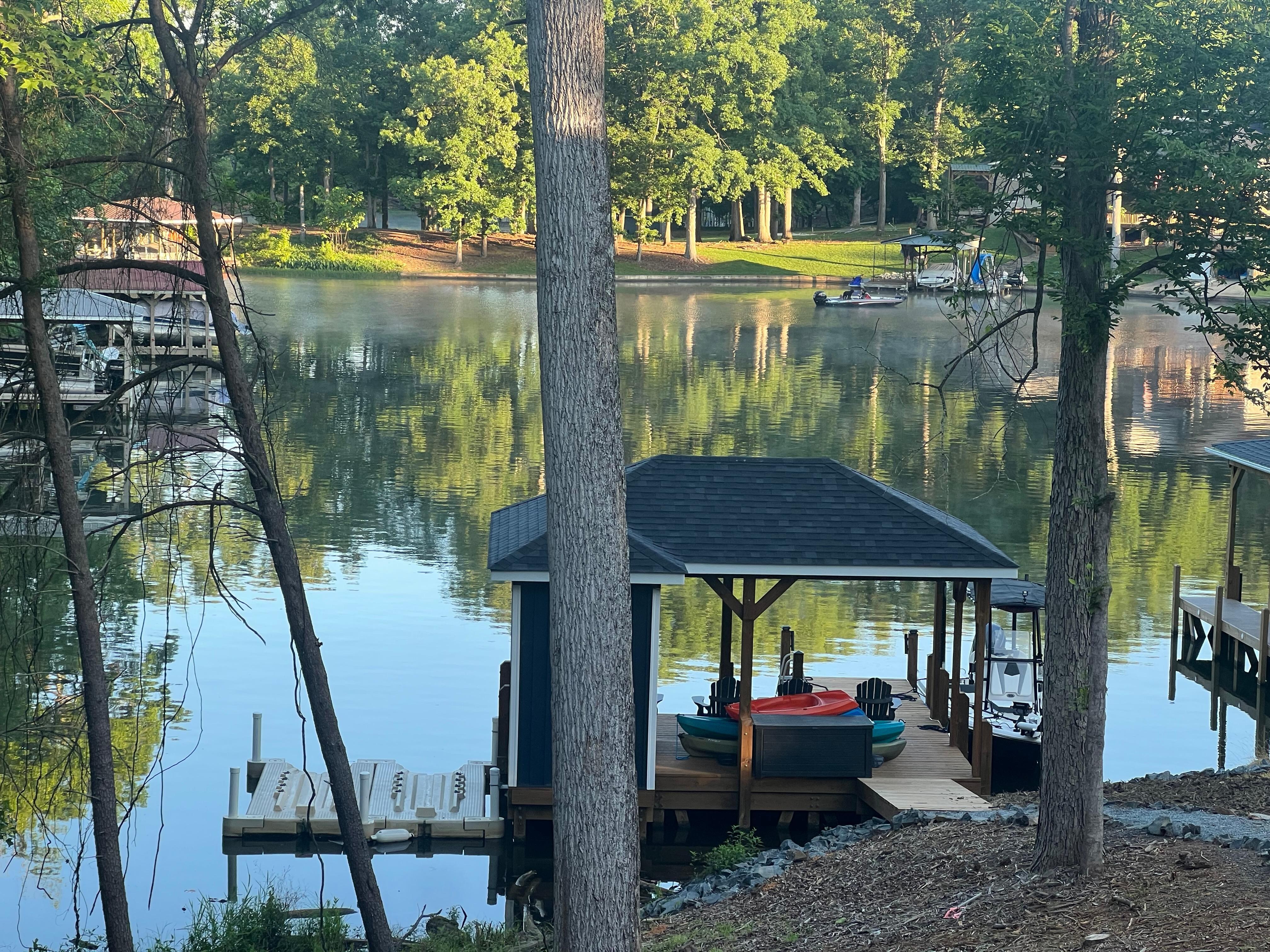 This is a new build and landscaping is in progress as is the walking path to the dock and the firepit.