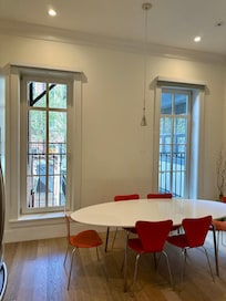 The main floor (Parlor level), with magnificent 11 foot ceilings and beautiful woodwork, is comprised of living room with TV and gas fireplace, as well as a brand new open plan Siematic kitchen with island and dining area. These two areas are separated by beautifully restored original pocket doors. Beyond is a powder room and a bedroom/den (sofabed) with an adjoining outdoor terrace in back.