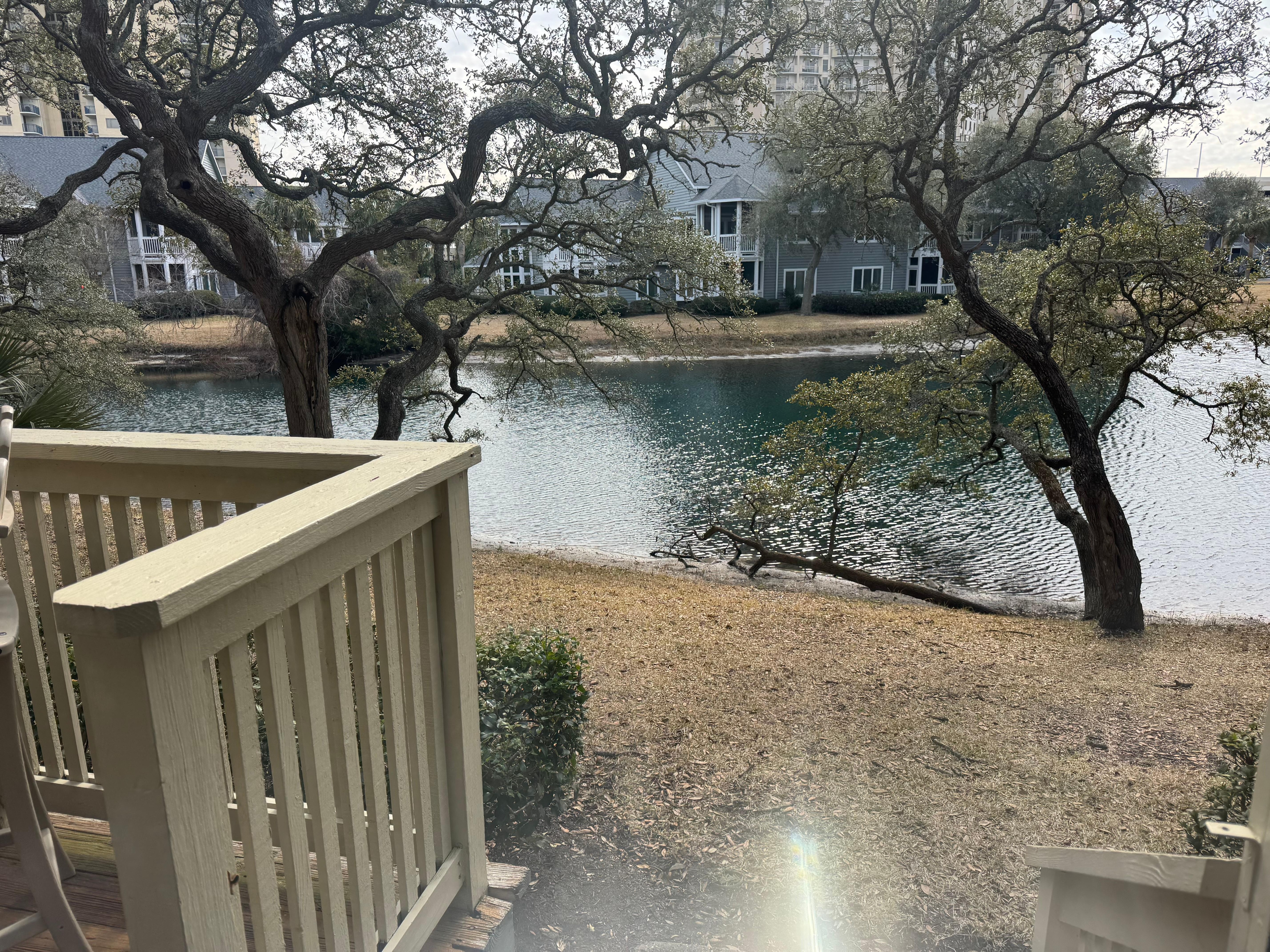 Our residence is a wonderfully cozy 2-bedroom, 2-bathroom ground floor villa located in the St. James Park community of Kingston Plantation...providing direct lakefront views! Our home has been recently renovated with ALL imaginable upgrades! There is ample sleep space for our guests including a King bed in the master bedroom and 2 Queen beds in the guest bedroom! Remodeled features include a renovated, fully operational kitchen with all upgrades such as black appliances, wood cabinetry, granite countertops, modern/contemporary pendant lighting above the bar and beautiful tile back-splash! New furniture pieces throughout...decorated in a comfortable Pottery Barn coastal motif! New in 2024 ...65 inch Roku Smart TV in the living room. High-def flat screen TV's in both bedrooms!