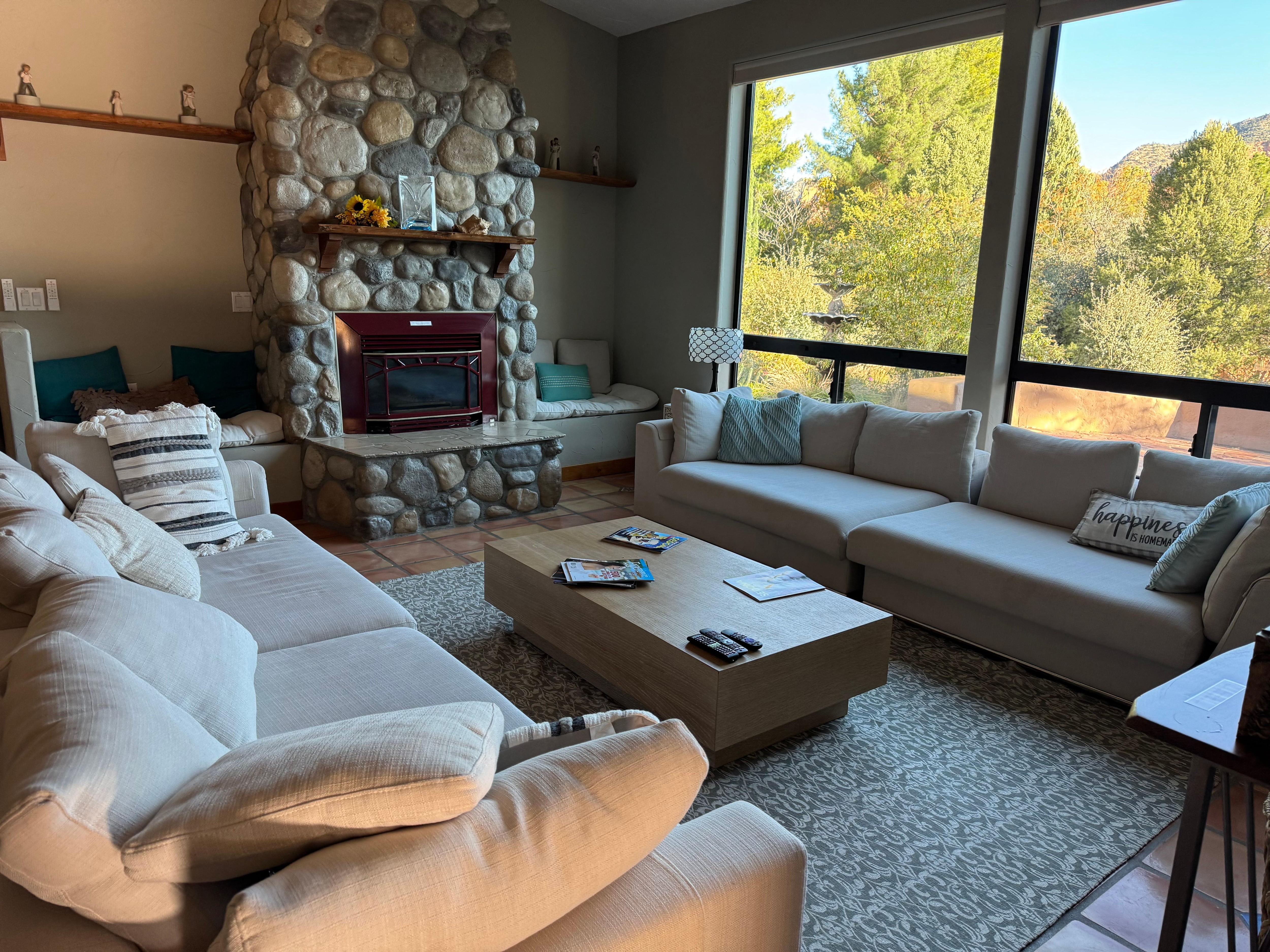 Living Room: Boasts modern, comfortable furnishings, including plush sofa seating and a Smart TV for your entertainment needs. A stoned decorative fireplace adds a touch of rustic charm, while abundant natural lighting and expansive windows offer breathtaking views of the red rock formations.