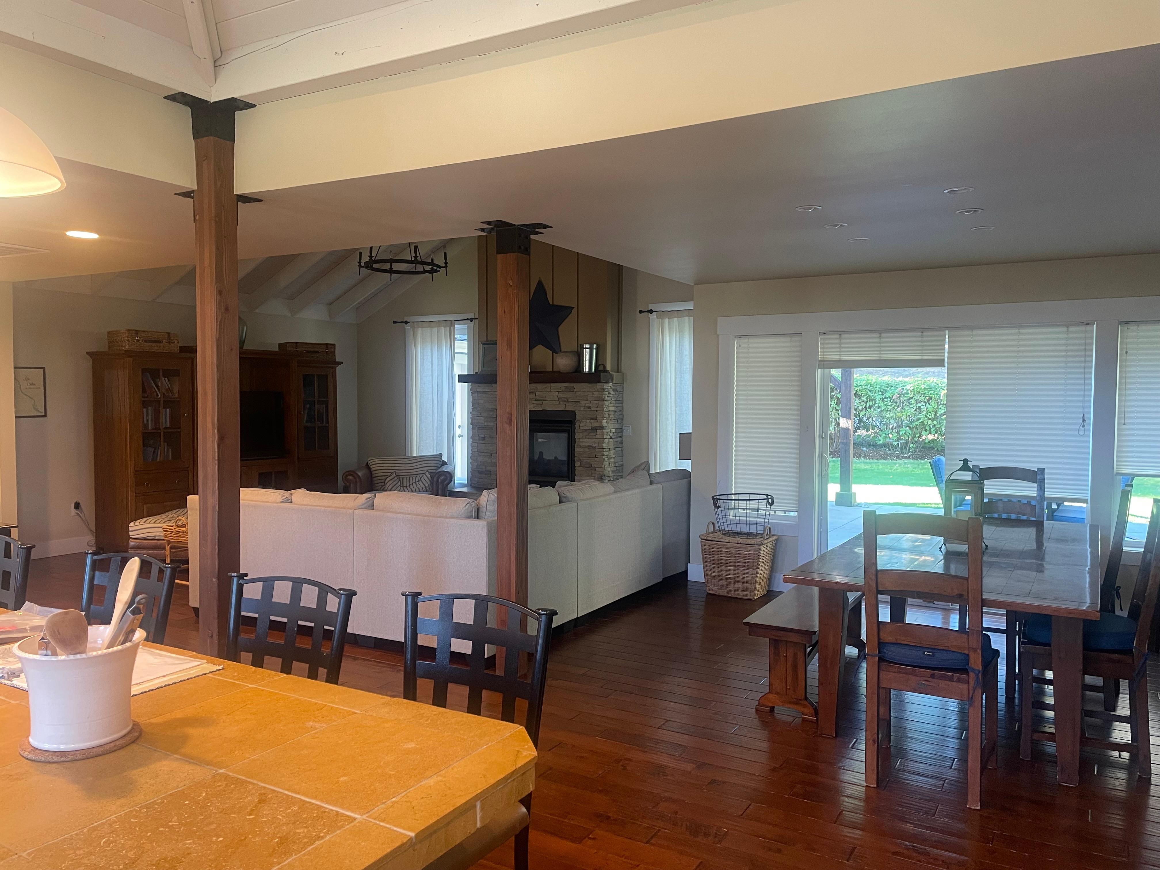 INDOOR LIVING: 2 flat-screen TVs, gas fireplace, vaulted ceilings, dining table