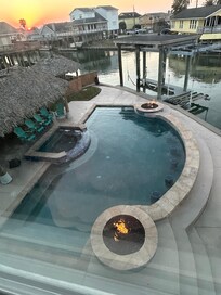 The Outdoor Space- Enjoy the pool and hot tub year round! The outdoor area also has a huge Adirondack chair that’s great for taking family photos, a large palapa that provides shade to the pool deck, double covered deck, fire pits at each end of the pool for a night swim, and a swim ladder attached to the dock, if guests would rather take a dip in the canal. The home features 2 single and 1 double kayak, 2 paddle boards, and numerous pool toys/floats.