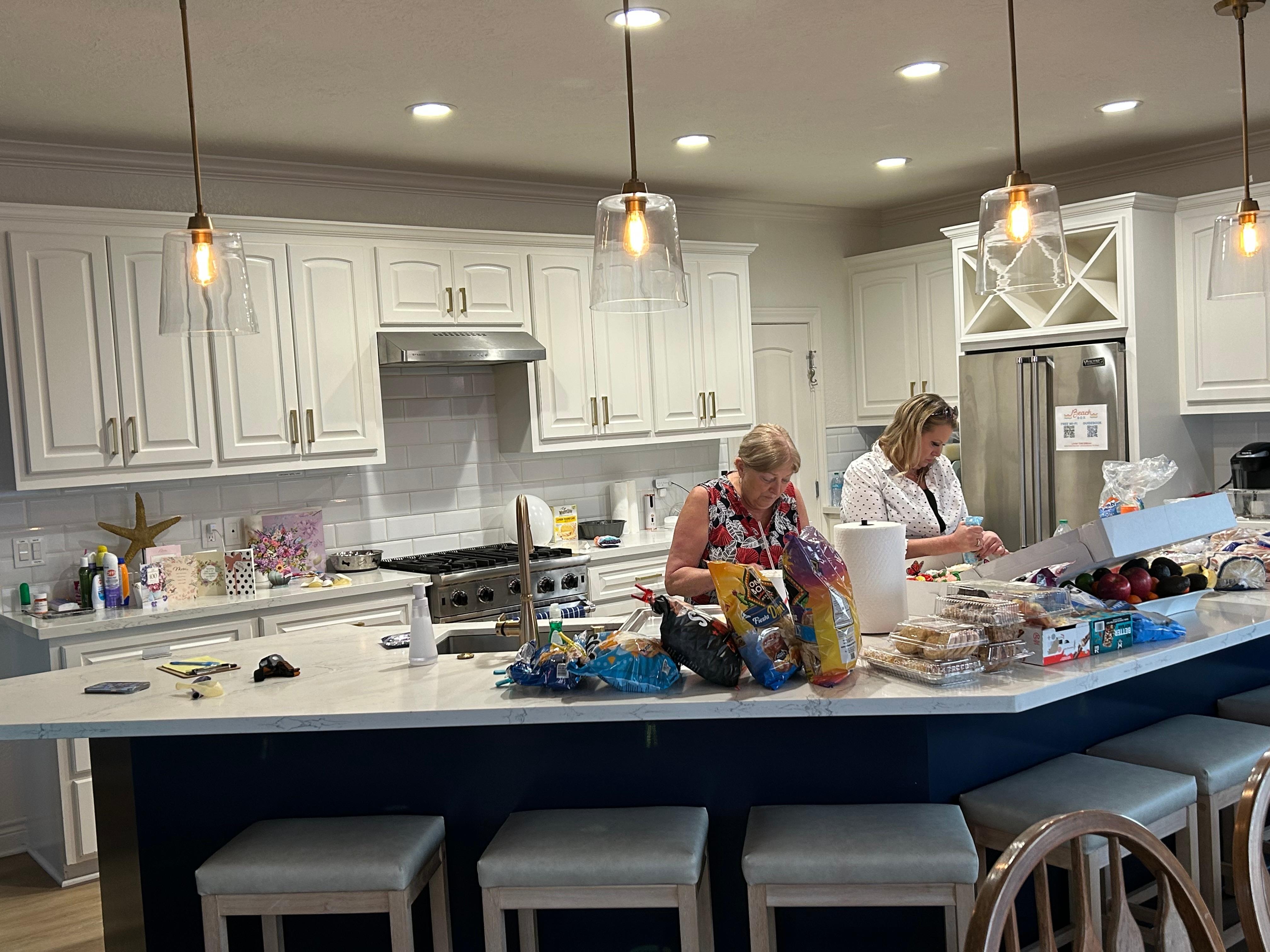 The Indoor Space- Interior features of Livin’ the Dream include a well-appointed open kitchen with a large island, living, and dining areas all with views of the water. The kitchen area is perfect for food preparation and entertaining simultaneously. The home has two Keurig machines (please bring your own pods) as well as a drip coffee pot (coffee and filters provided). The living area features multiple sofas and ample seats for everyone to enjoy the large TV, and large dining table in this open-concept home. Walk out onto the balcony for another mini dining table, or the 2nd exterior dining table on this massive deck.
