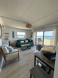 Fall to sleep with the sound of crashing ocean waves! Experience the charm of Ormond Beach from this end unit, third-floor oceanfront condominium. Recently renovated, this exquisite property features two bedrooms: a master suite with a king bed and a second bedroom with a queen bed and twin trundle, ideal for families or groups of friends. Sound machine alarm clocks and pad chargers are available in each bedroom for your enjoyment. The condo boasts two well-appointed bathrooms and a cozy living room with a convertible sleeper sofa, accommodating up to two additional guests. This unit is smoke and pet free. Delight in breathtaking sunrises and rocket launches from the expansive balcony, while savoring a curated selection of coffee provided for your enjoyment. The oceanfront pool, with ample lounge space, invites you to unwind and bask in the sun. Beach chairs, beach tent and towels are available for your seaside adventures. Conveniently located, the condo is within a short drive to numerous restaurants and bars, some just a 15-30 minute stroll along the beach. This refined retreat offers all the amenities you need to relax and immerse yourself in the beauty and tranquility of Ormond Beach.