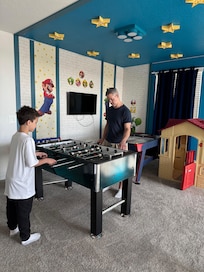 Outside, your private oasis awaits with a heatable pool and patio, ideal for moments of serene leisure. On the first floor, enjoy a stylishly decorated queen bedroom with a convenient bathroom and a beautifully appointed king suite with its own en-suite bathroom. Upstairs, the fun begins in the Mario Bros-themed game room, where kids and adults alike can play and unwind. The upper level also features a luxurious master king suite and two magical themed bedrooms: the Tangled-themed room with two double beds and the whimsical Minions-themed room, also with two double beds.