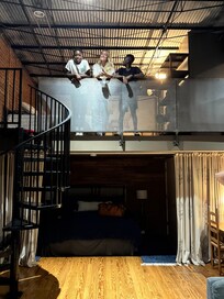 The master bedroom has a king size bed and an open concept with a privacy curtain. The upstairs loft is above the master bedroom accessible by a spiral staircase has two full size beds overlooking the living area. Drown out the sounds of bustling city life with the available sound machines in each sleeping space.