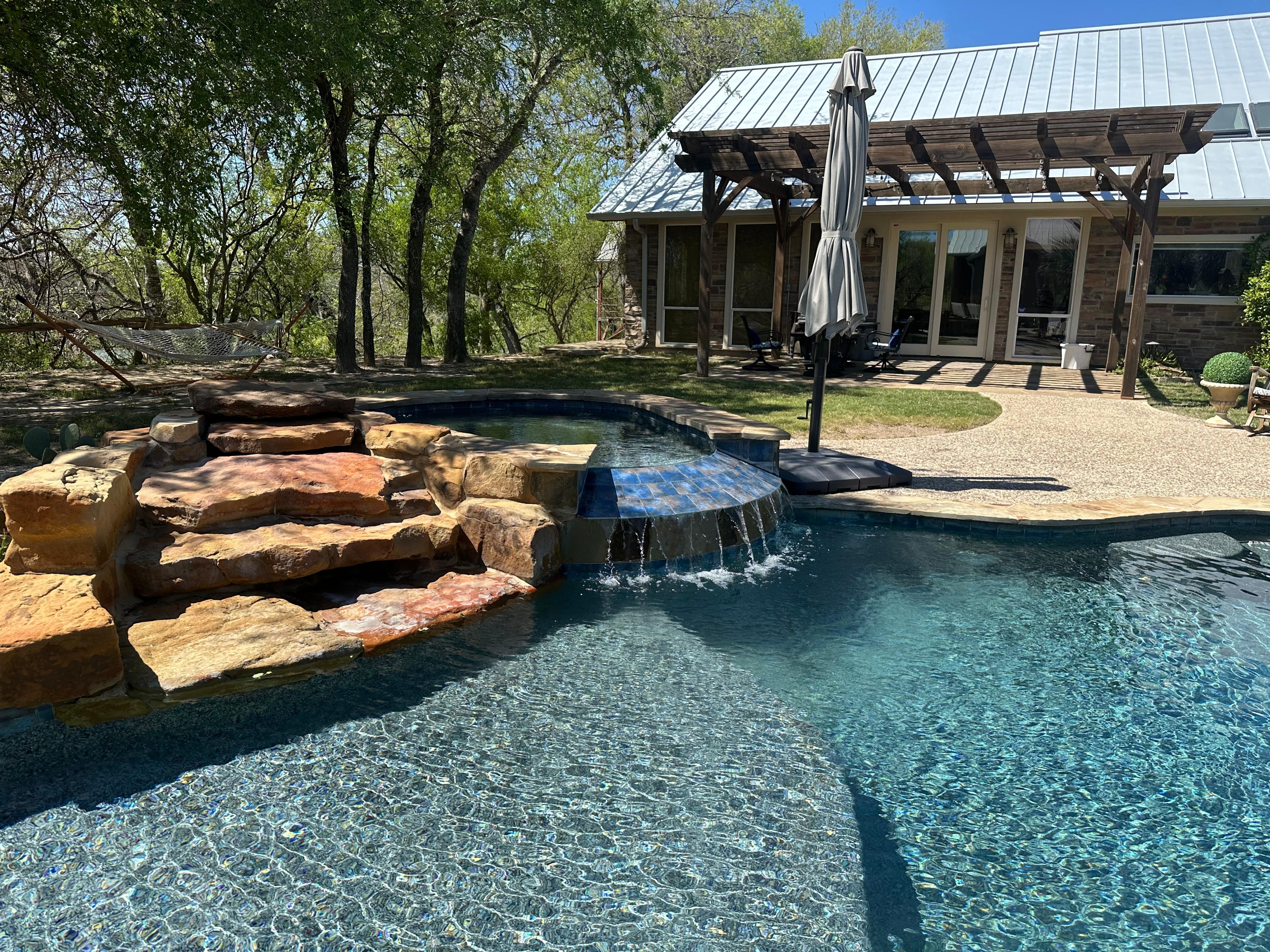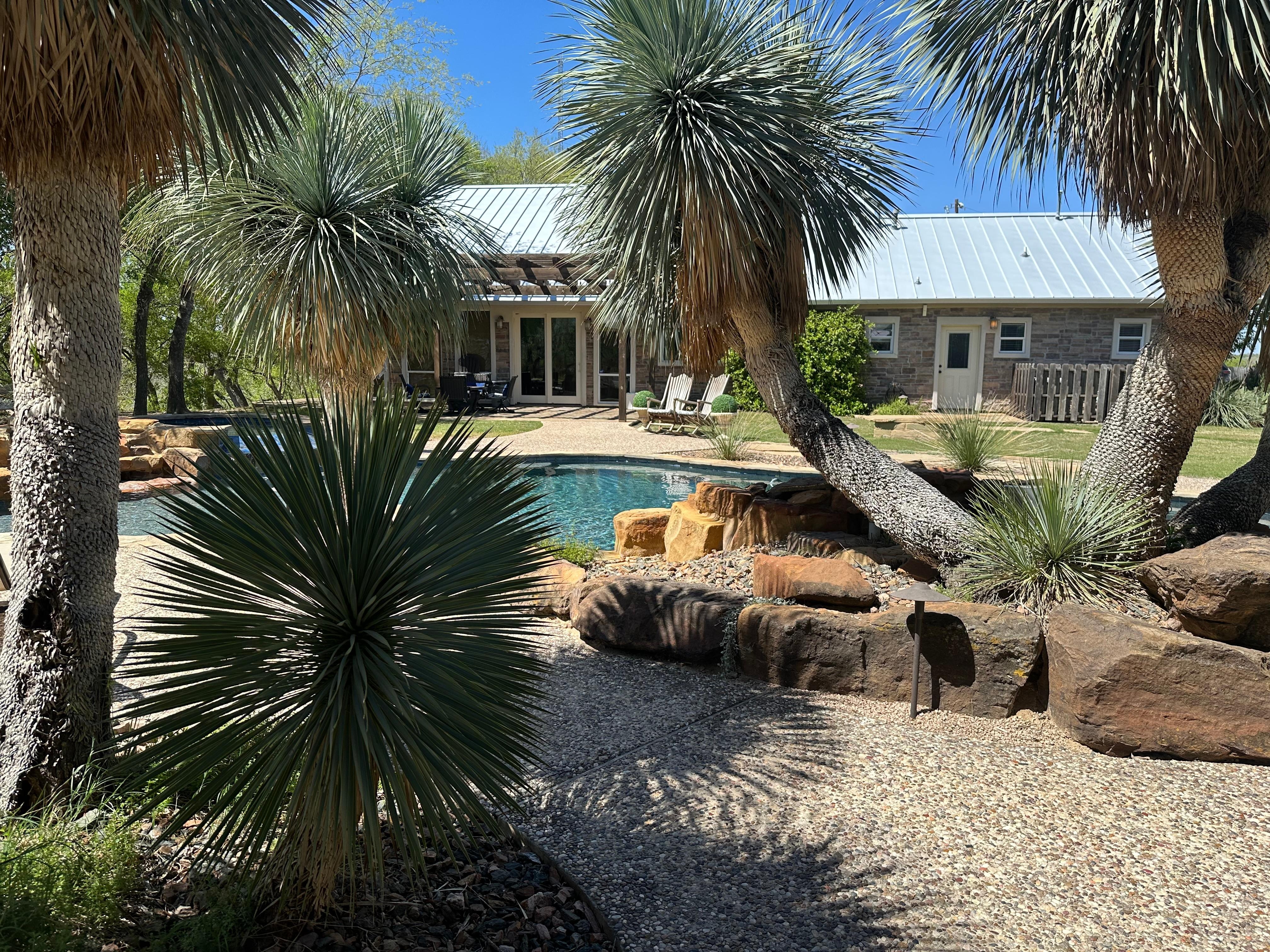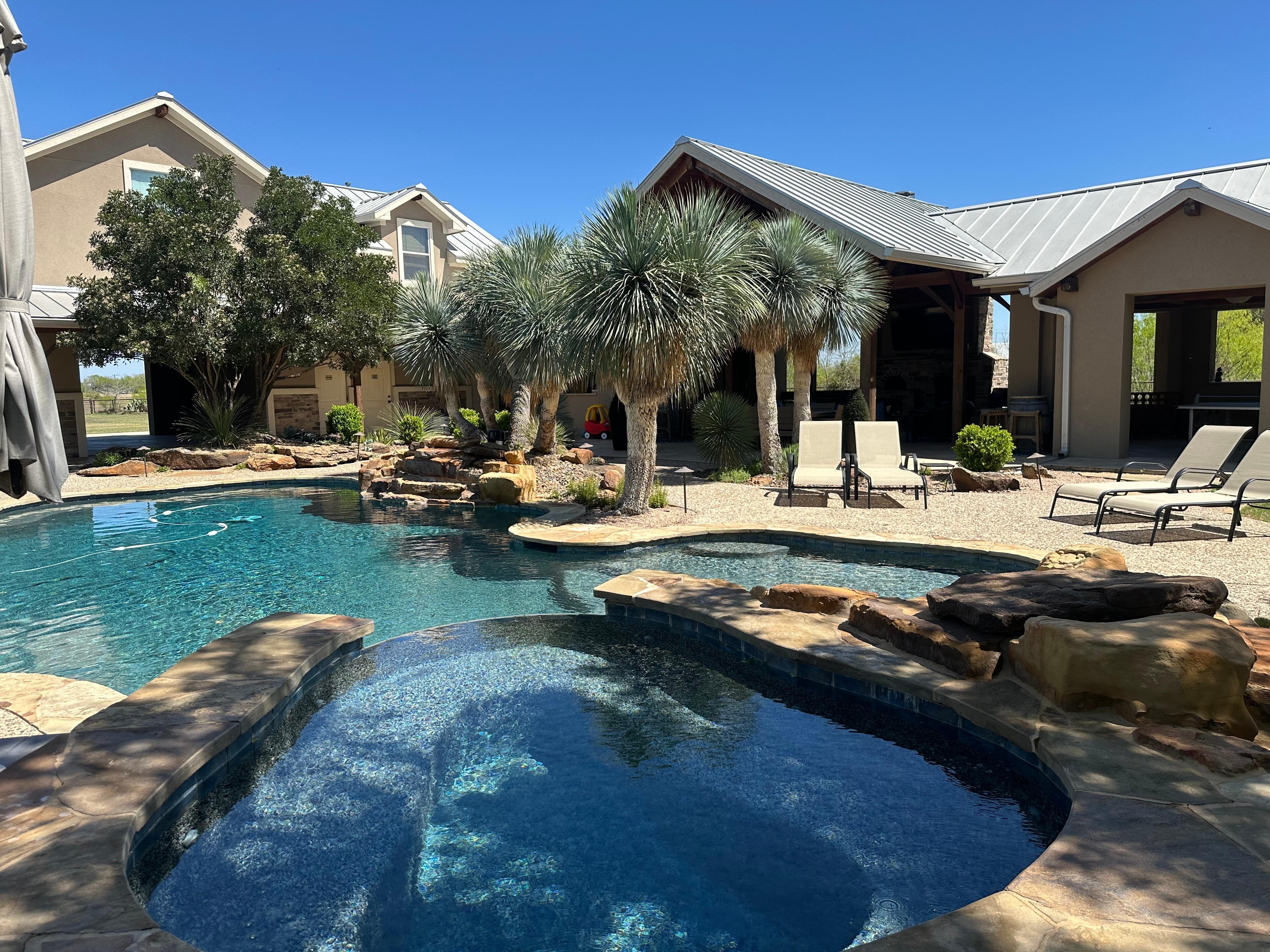 When you first arrive to High Bank Ranch you will immediately see why we are the destination for family get-togethers and Guadalupe river fun. The 2 house complex is laid out to capture outdoor activities along with the ability to sleep 22 people in comfy beds. You can begin your day with poolside coffee highlighted by the sound of waterfalls and a cool breeze. When the you are ready for more activity there is volleyball/badminton/ping pong/ yard games, kayaks, and pool. The day only gets better in the first class outdoor kitchen built in 2016 (gas grill, electric oven/stove, cocktail bar sink, fully stocked cookware and utensils, fridge, wine fridge and deep freezer), the aroma from the Pizza Oven, and the 70 in. TV in the outdoor living space will keep your guests happy. Plenty of room for our guests to spread out, large driveway, and privacy galore on 63 acres. An added bonus is a full hookup for RV and barn/pasture if you would like to bring your horses, trail riding, hiking and biking.
