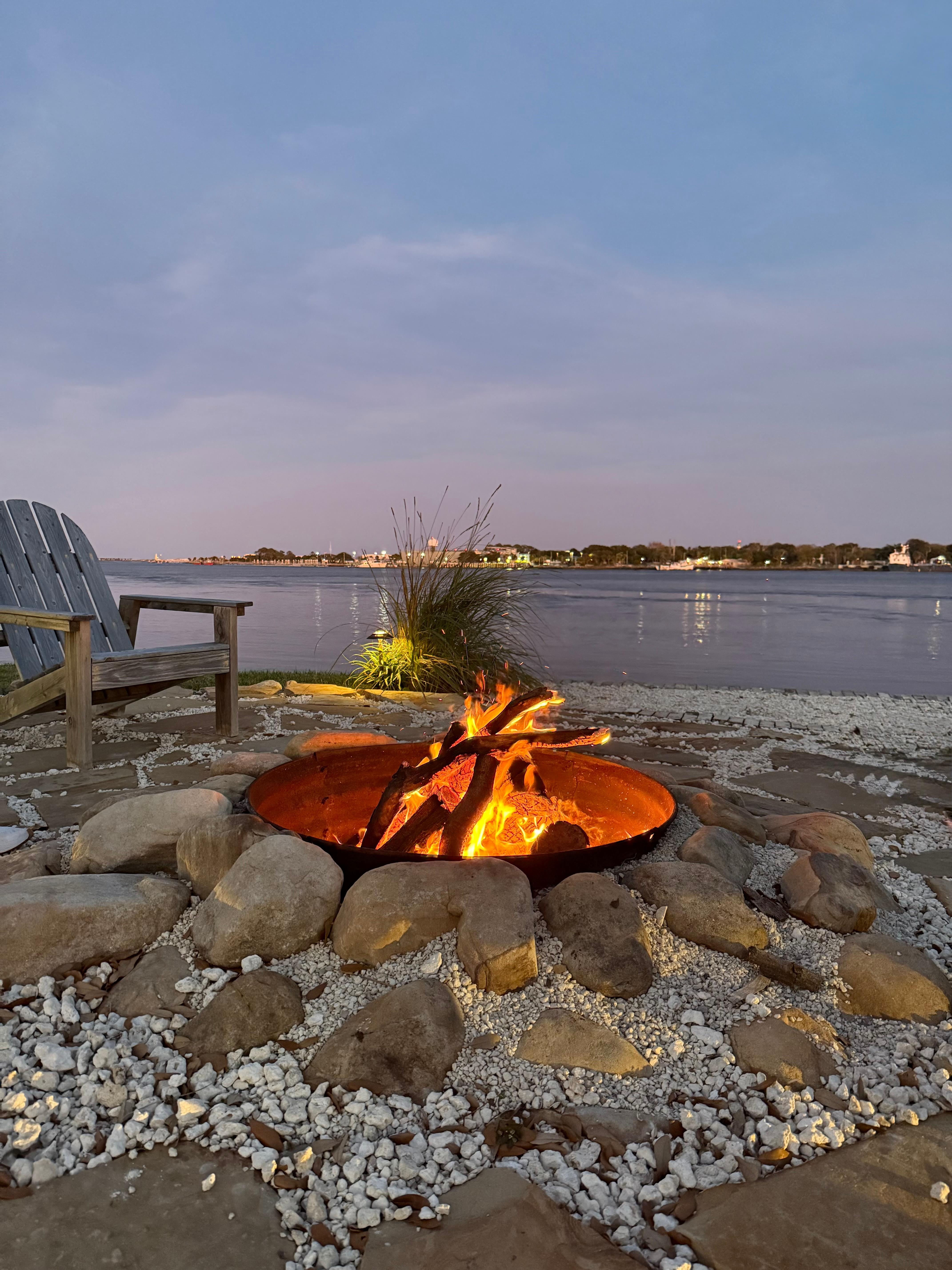 As the day comes to an end and the sun begins to set behind you, all gather at the camp area, nestle back in your cozy Adirondack chairs, and have a special toast with family and friends by throwing a few wood logs on the fire, watching the picturesque sunset on the clouds as they “dance” and change contrast. Throw some steaks, fish, chicken, pork, brisket, and enjoy barbequing on the outside grills provided, while watching the sunset glimmer off the ocean meeting the river .