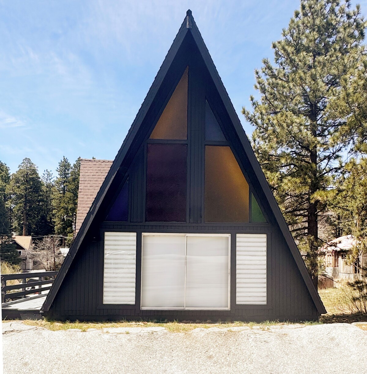 Born from the summer of love this colorful A-Frame featuring vintage stained glass is famous on the mountain. Open, airy and tranquil it's on a 1/3 acre with gorgeous soaring pines. Two bedrooms including a loft with a desk, full kitchen and gorgeous kaleidoscopic sunrises. Central Air and forced air heating, lots of parking, easy on / off to the highway you can be at Snow Valley or Skypark in 5 minutes. The property includes 2 bedrooms, one on the main floor and a loft room. The loft room features stunning, colorful sunrises and forest views from the back window. It has a big screen TV and desk if you need to do some research, or are struck with artistic inspiration. The main floor bedroom includes a large screen TV, king size bed and sliding door access to the back patio deck. The patio has neighborhood views, and the elevation (almost 7000 feet)+ lack of light pollution make it great for stargazing. Fireplace for show only, not functioning. Full dish set, utensils, dishwasher, full kitchen. Central air conditioning, very fast WIFI, forced air heat. Extremely convenient entry / exit, short trip to the highway.