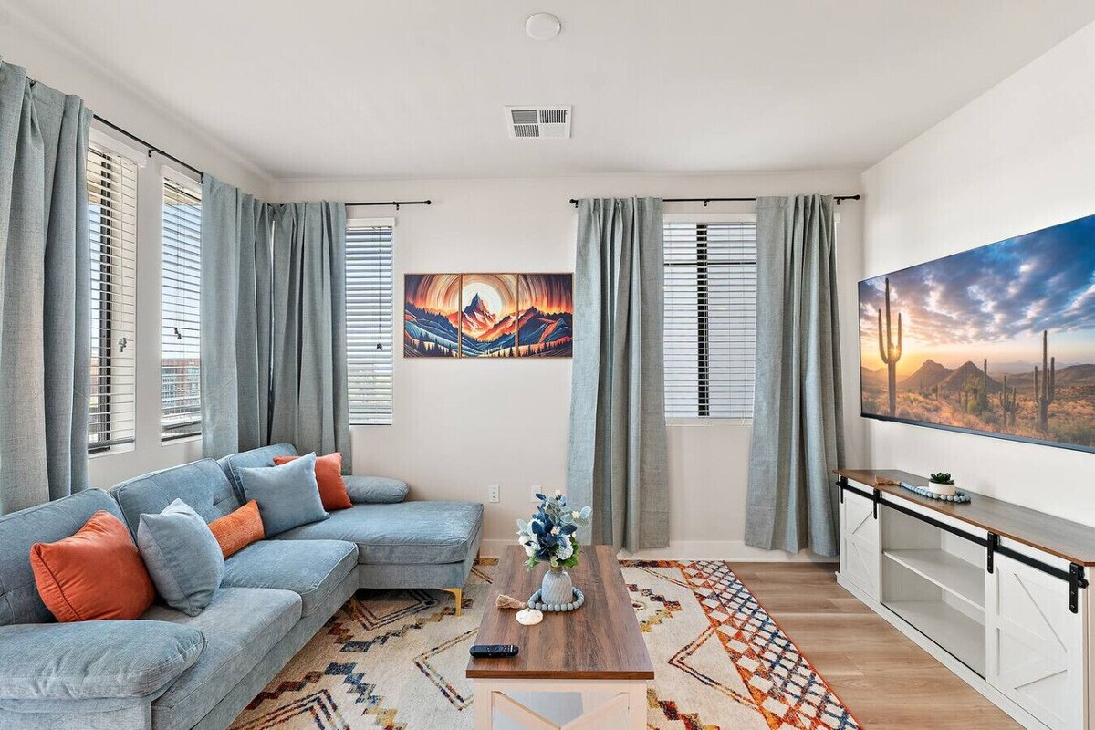 Experience upscale living in this sleek 2BR/2BA Scottsdale retreat near Papago Park, Old Town, Desert Botanical Garden & Camelback Mountain. Enjoy a chef’s kitchen, wine fridge, walk-in closets, private patio, and luxe baths. Steps from hiking trails, golf, shopping, dining, and spring training.