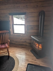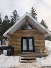 This is a charming and cozy log cabin. Ideal for a romantic getaway, there is a small sofa that converts into a sleeper couch, that can accommodate an extra 2 guests. There is a full kitchen, a barbecue and your own private hot tub on the side of the property. There is a rotating staircase leading to the mezzanine style bedroom , with a Queen sized bed. Please note that if you are tall, you will have to watch out for the ceiling. We offer a keurig coffee machine, and charming gas fireplace and air conditioning the summer. You will have access to the entire campground for snowshoeing and walking in winter and access to the community pool and beach in summer.