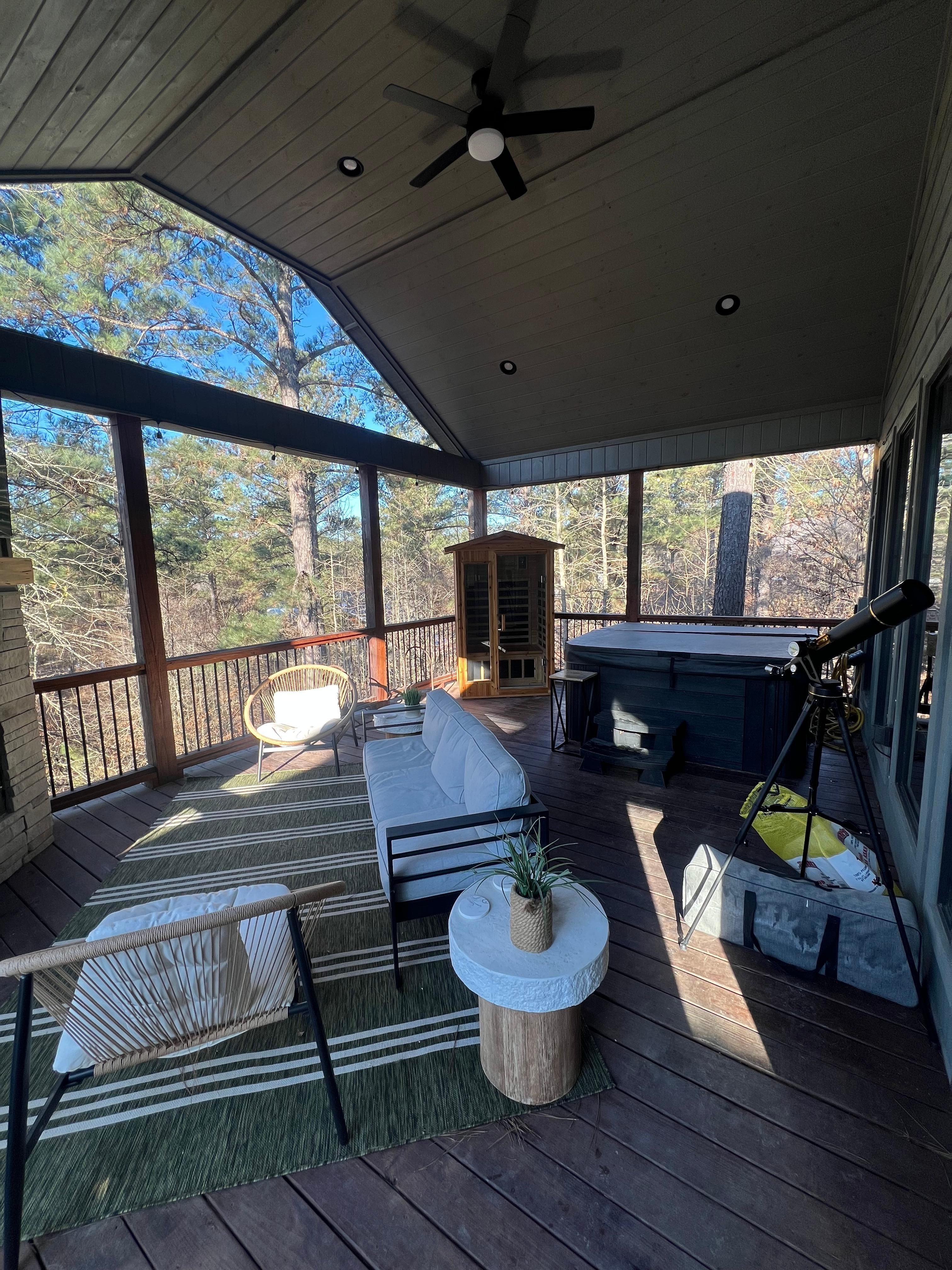 Experience Broken Bow at its finest in this charming 1-bedroom cabin. Drift off in the king bed, enjoy extra space with the living room’s sofa bed, and refresh in a well-equipped bathroom. Step outside and immerse yourself in everything that makes this stay special — a private stargazing dome, a rejuvenating sauna, a hot tub, a hammock with a stunning view, and an outdoor projector perfect for cozy movie nights. Whether you’re exploring, relaxing, or reconnecting, this cabin is designed for unforgettable moments.