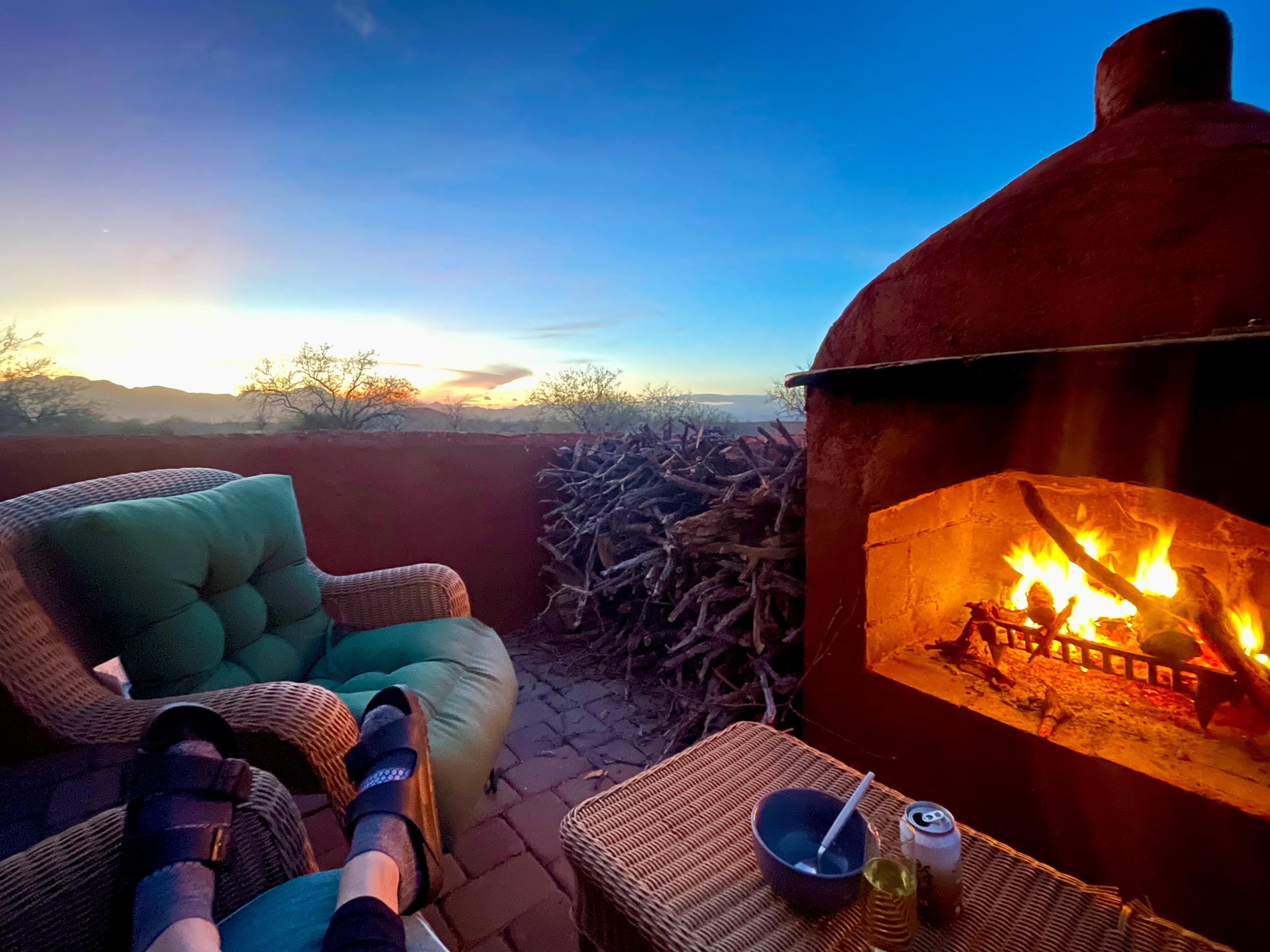 Secluded desert guest house with outdoor fireplace.