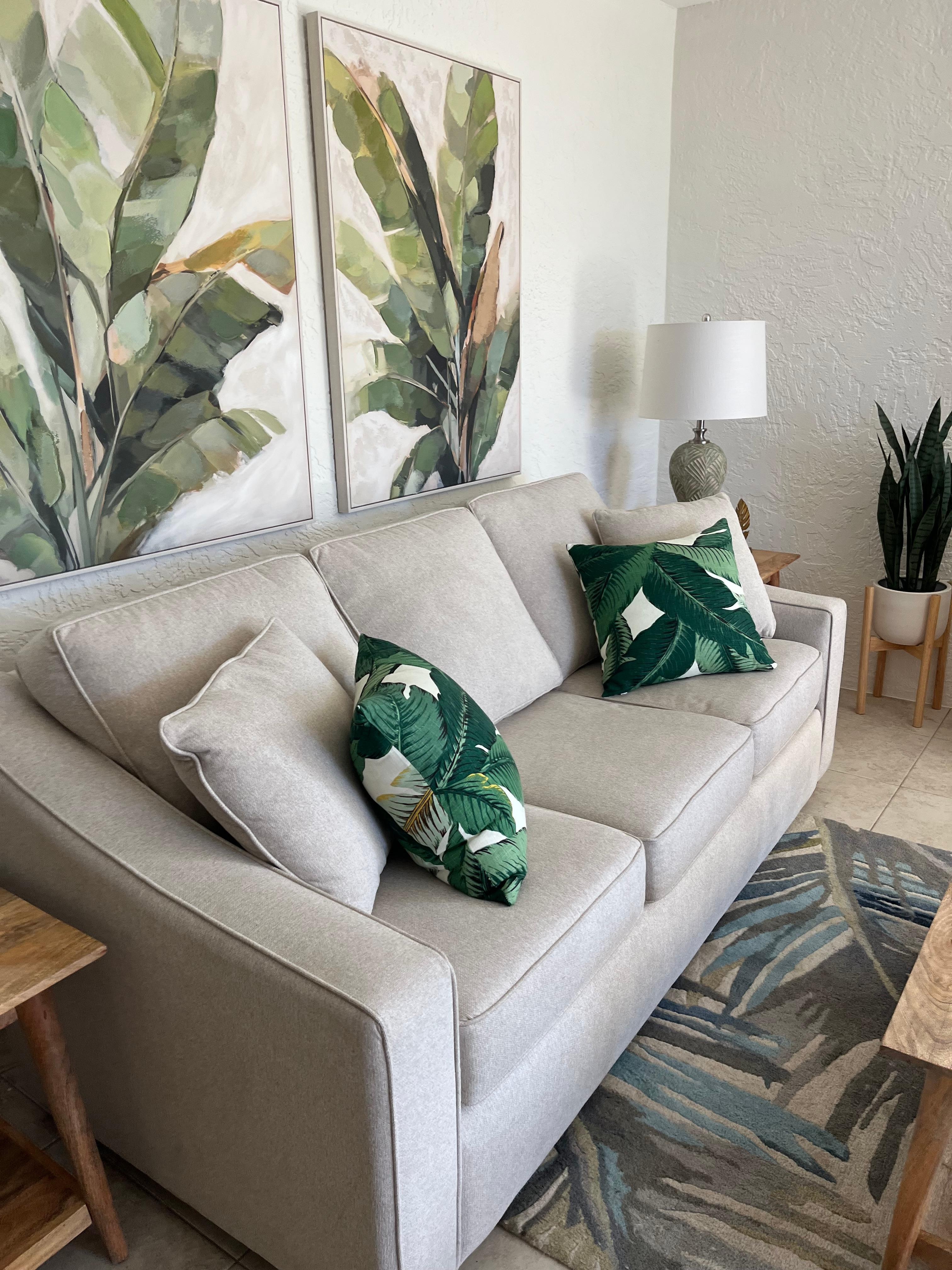 At the end of the day, retreat to a peaceful bedroom with soft garden & ocean views, a walk-in closet. Comfortable Queen Sized bed in the bedroom. There is a Queen Sized sleeper sofa in the Living Room as well.