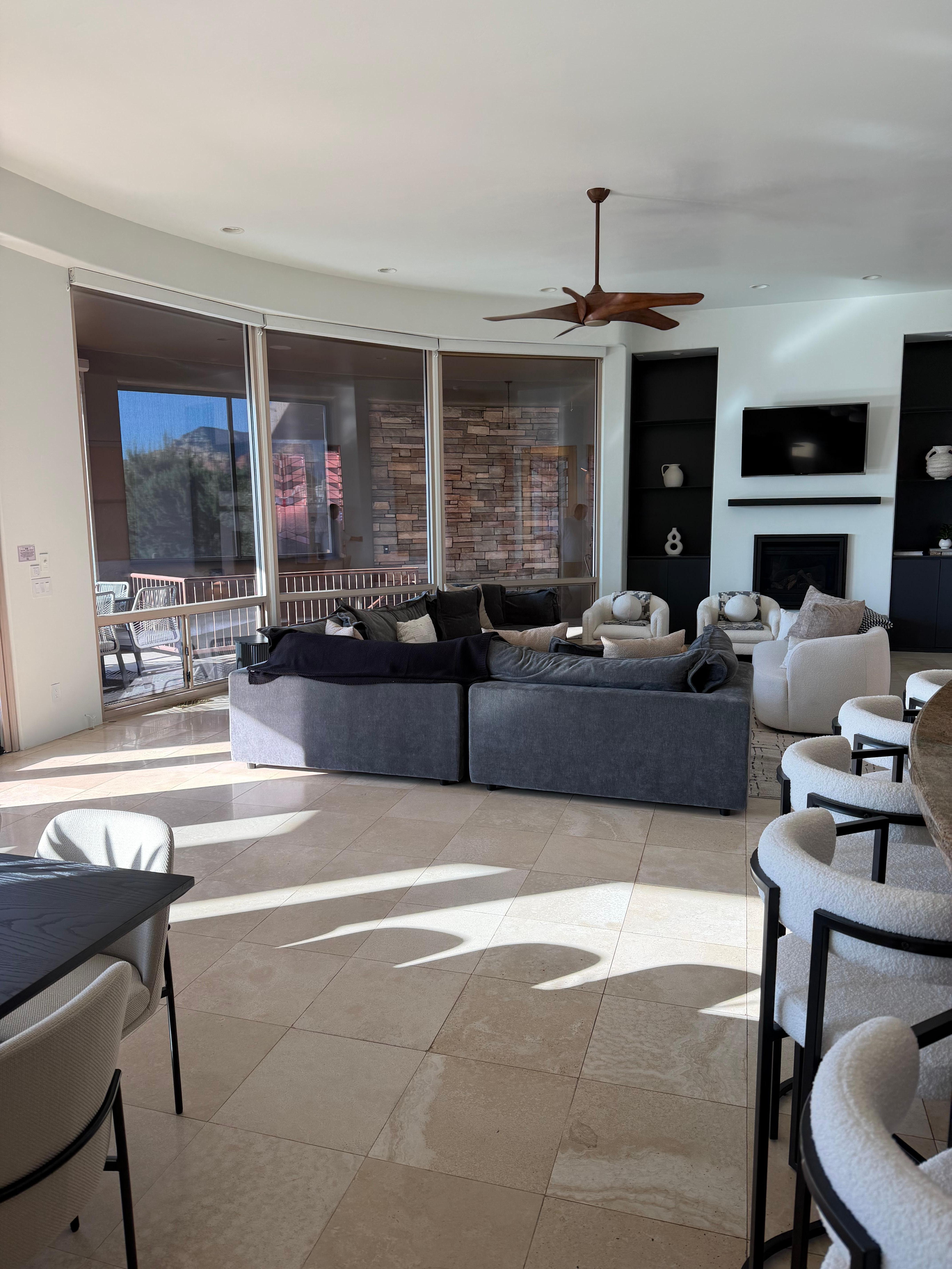 Welcome to your Sedona hillside retreat with sweeping red rock views. This spacious home features panoramic windows, an open-concept living space, chef’s kitchen, movie theater room, hot tub, two fire pits, multiple terraces, outdoor dining, and a sunroom/yoga space. Whether you’re visiting Sedona for hiking, wellness, family gatherings, or a memorable getaway with friends, this unique property offers space, comfort, and amenities rarely found together in one home!