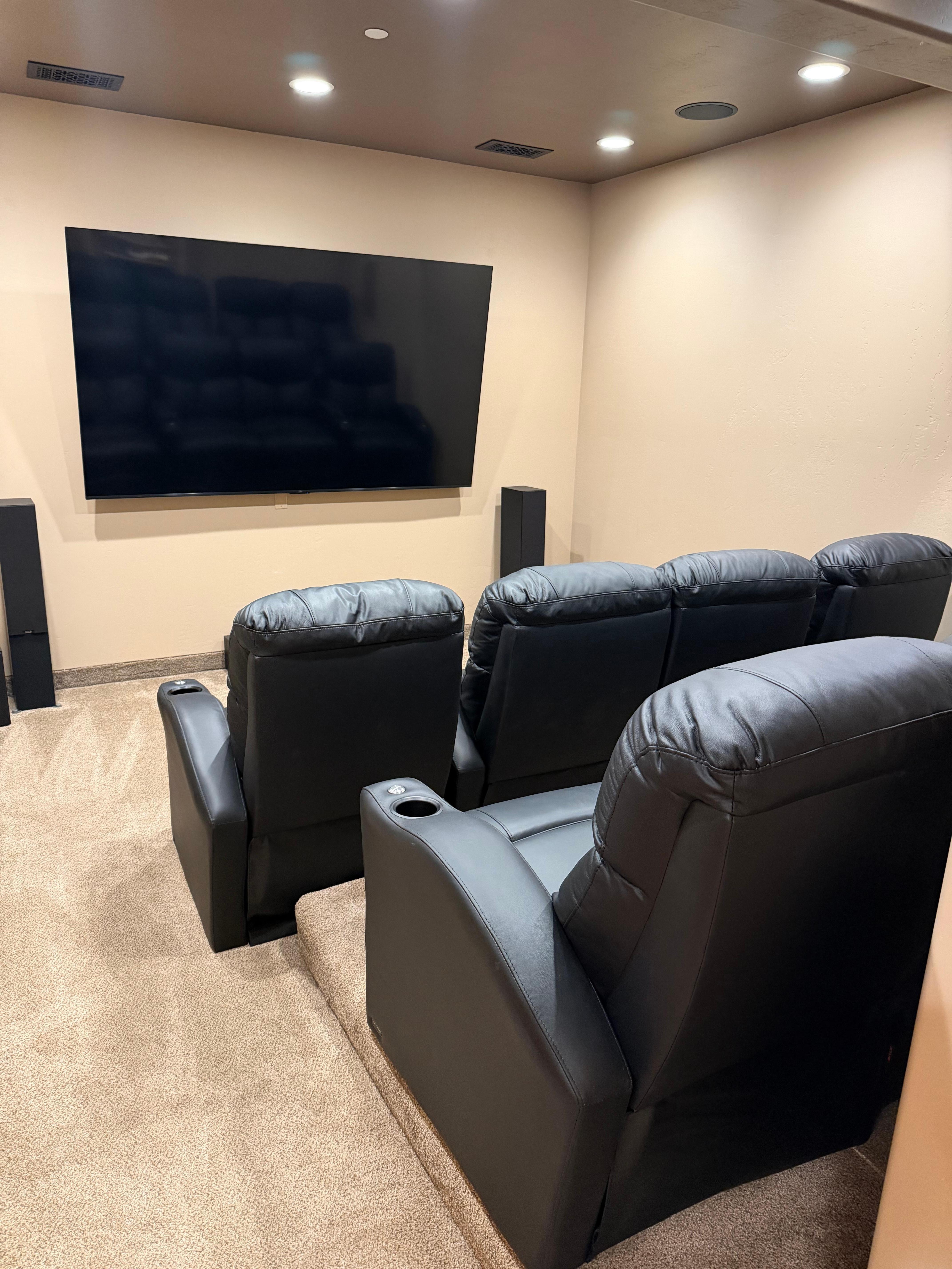 The lower level : Here you’ll find the dedicated movie theater room, and a convenient kitchenette with microwave, mini fridge, sink, and counter space for snacks and drinks.