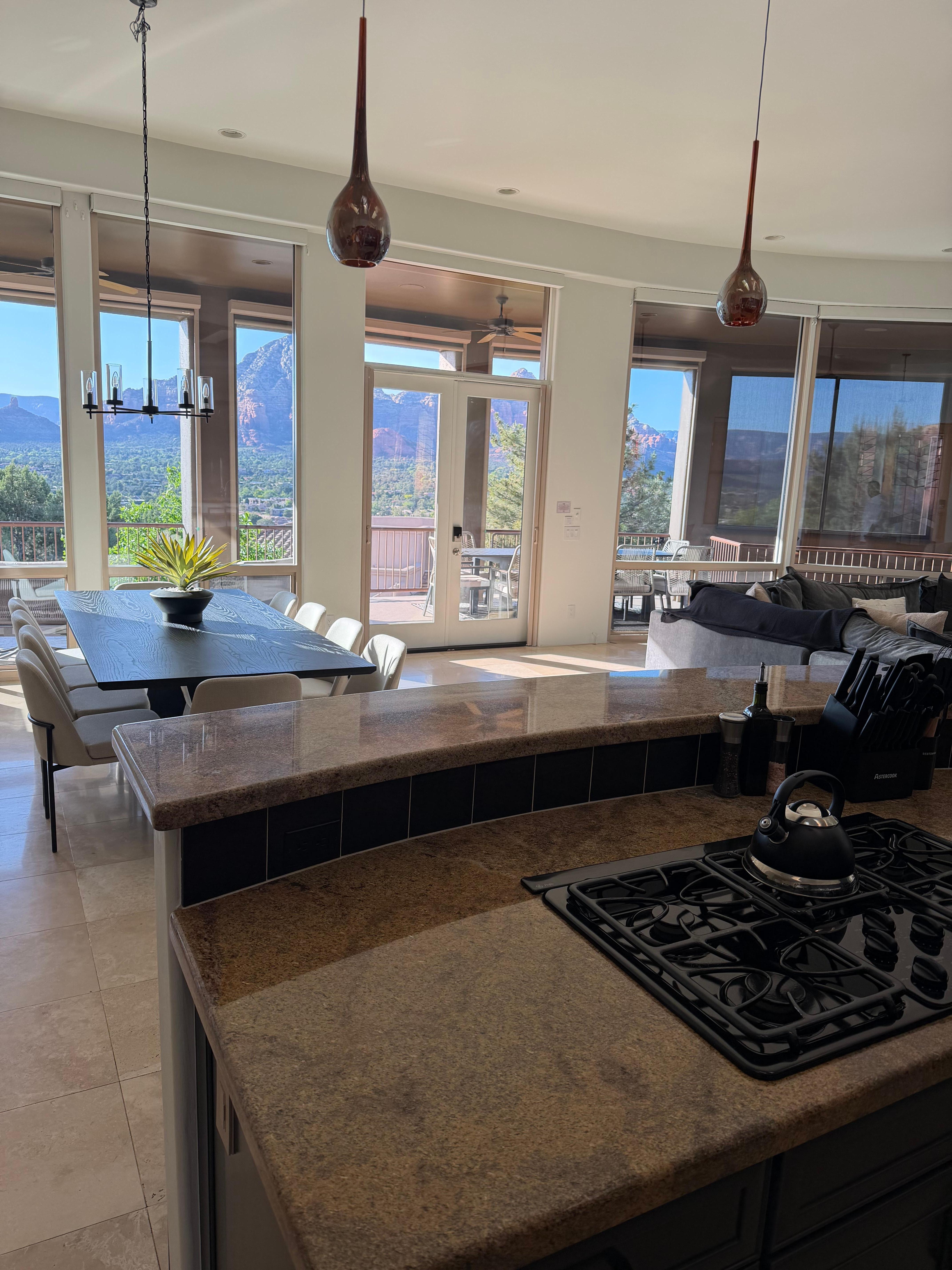 Just outside, the expansive upper terrace offers multiple seating areas, outdoor dining, and beautiful panoramic views — perfect for morning coffee or evenings under Sedona’s star-filled sky.