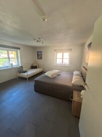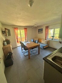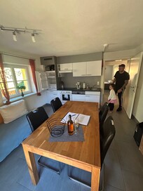 Wir sind angekommen und waren sofort verliebt in die Umgebung und die Wohnung. Wir haben erst vor Ort bemerkt, dass normalerweise Gäste mit Hunden dort hin kommen, aber das hat uns nicht gestört, man hat keinen einzigen Hund bellen hören. Vom Garten aus konnte man direkt einen kleinen Waldspaziergang machen und kam direkt unten an den Grenzfluss zur Schweiz an. Wunderschön uns vor allem idyllisch ruhig. Also wer Ruhe möchte, ist dort genau richtig. Zum nächsten Ort musste man ca 15 Minuten fahren.Wohnungen war super groß und sauber. Zu unserer Überraschung, war sie mit allem ausgestattet (Salz, Öl, Seife, Spülmittel, Müllsäcke, Klopapier, Zewa, Spülmaschinentabs, Weinflasche zur Begrüßung, Geschirrtuch, Badvorleger, Spülmaschine, Toaster, Wasserkocher, Backofen, Mikrowelle usw)Die Dame, die das alles verwaltet hat uns super herzlich am nächsten Morgen begrüßt und hat sich super gesorgt. Meine Tochter hat sich auch super gerne mit ihr unterhalten. Man sollte sich nicht ins mobile Daten Netz einwählen, kann sein, dass das Handy sich in der Schweiz einwählt. Also alles in allem würden wir diese Unterkunft definitiv weiterempfehlen!