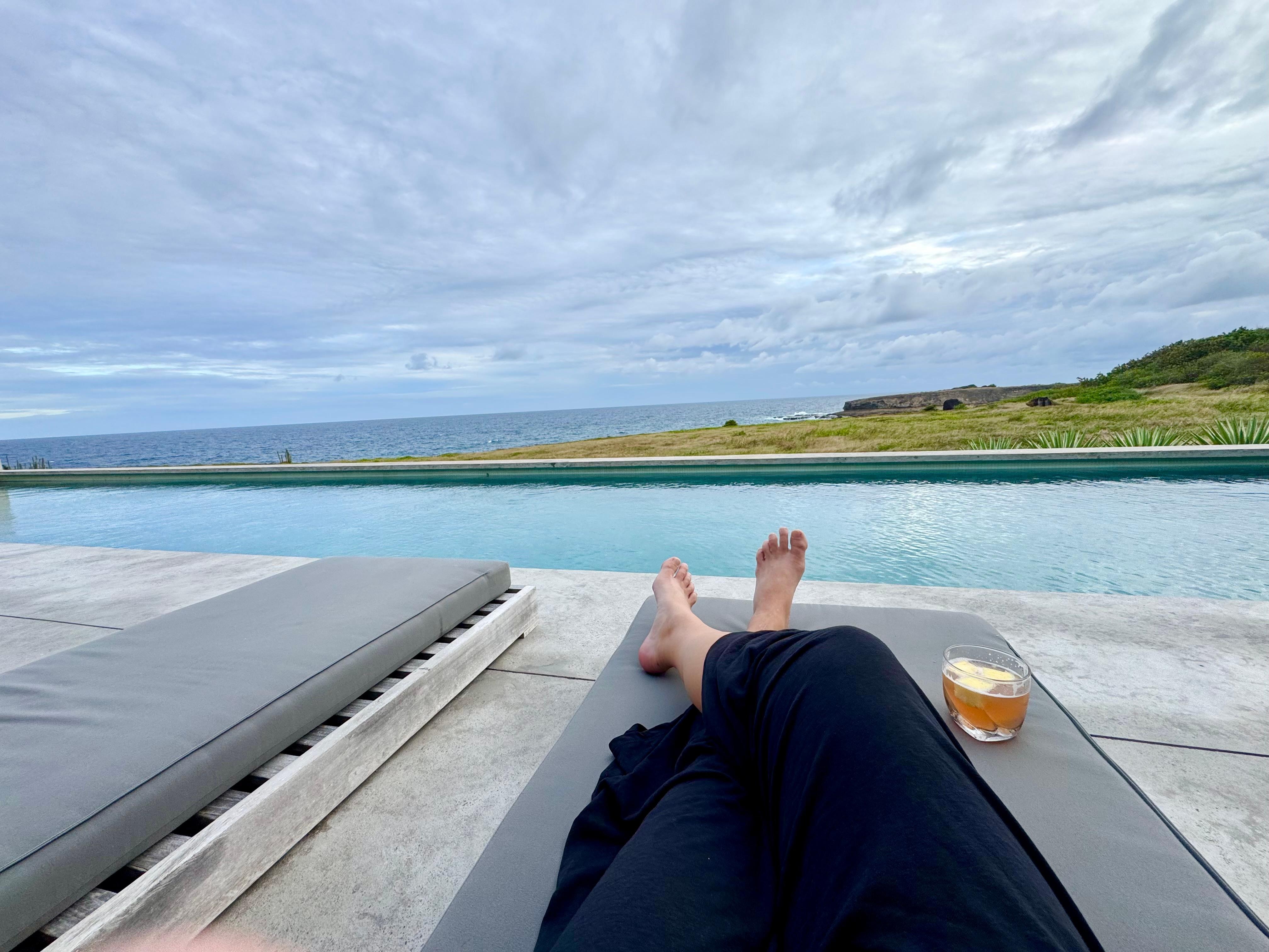 The Main Unit is the feature unit of the House, with a full kitchen, large open living room and bedroom with private bath and outdoor shower. The living space opens to patios north and south and adjoins a 60' pool spanning the length of the living area. The kitchen has a full sized stove, oven, dishwasher and a large island with seating for 8. A rooftop patio beckons for early morning yoga sessions and evening drinks as the sun sets over the hills of St Lucia.