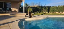 very recent villa 145 m2 air-conditioned swimming pool large garden 900 m2 enclosed and planted with trees. 3 parental suites wc, fully equipped fitted kitchen fridge dishwasher microwave induction hob washing machine small household appliances open onto large living room dining room equipped with tv and internet. 5 minutes from the beaches of canet, leucate, torus, barcares ........ perpignan is less than 10 minutes, near shopping center, 150 km from barcelona. the villa des vignes can accommodate 8 to 10 people. large 900 m2 enclosed and planted garden with fitted terrace, 8x4 swimming pool, garage. ideally located between sea, countryside and mountains.