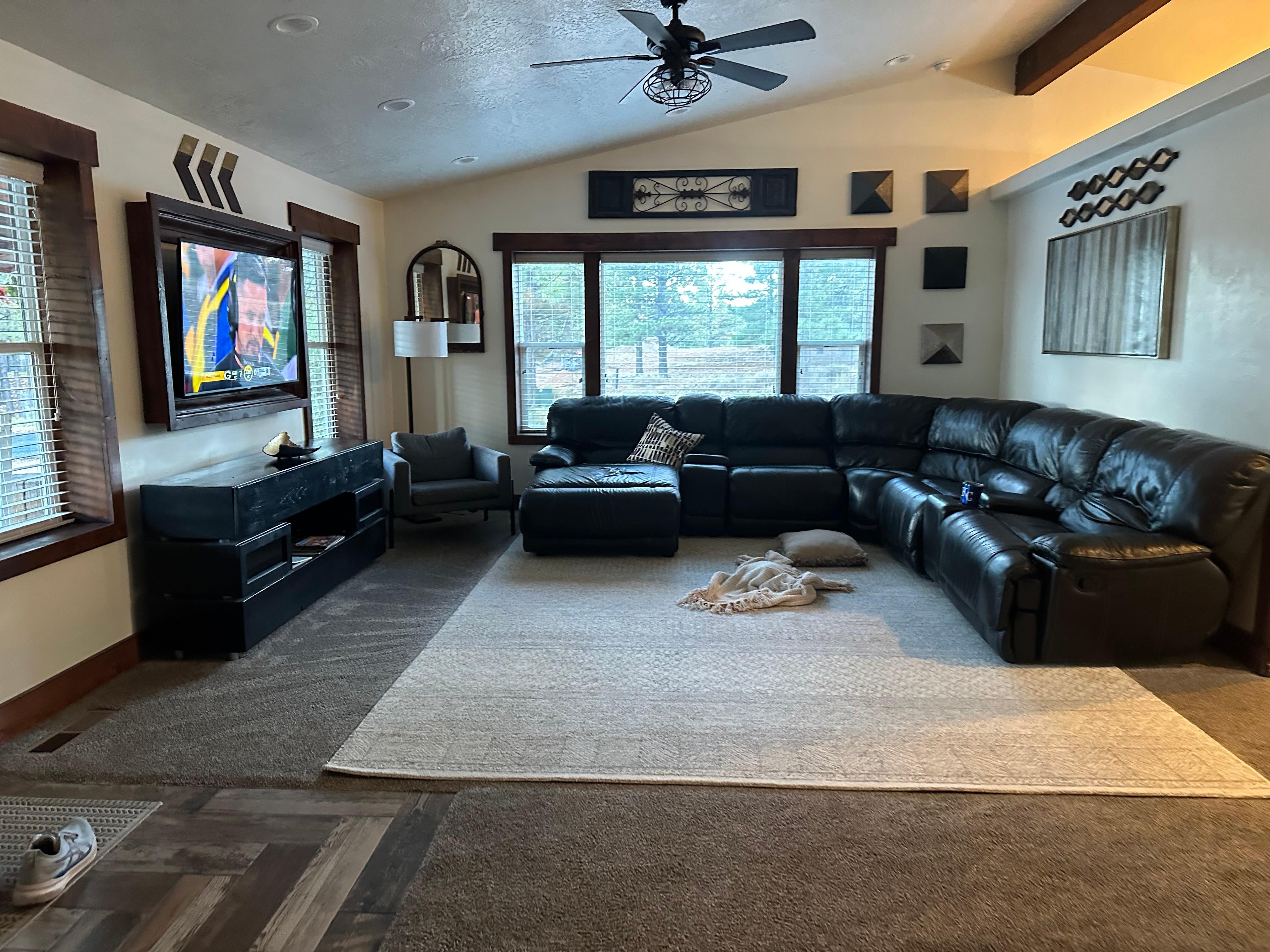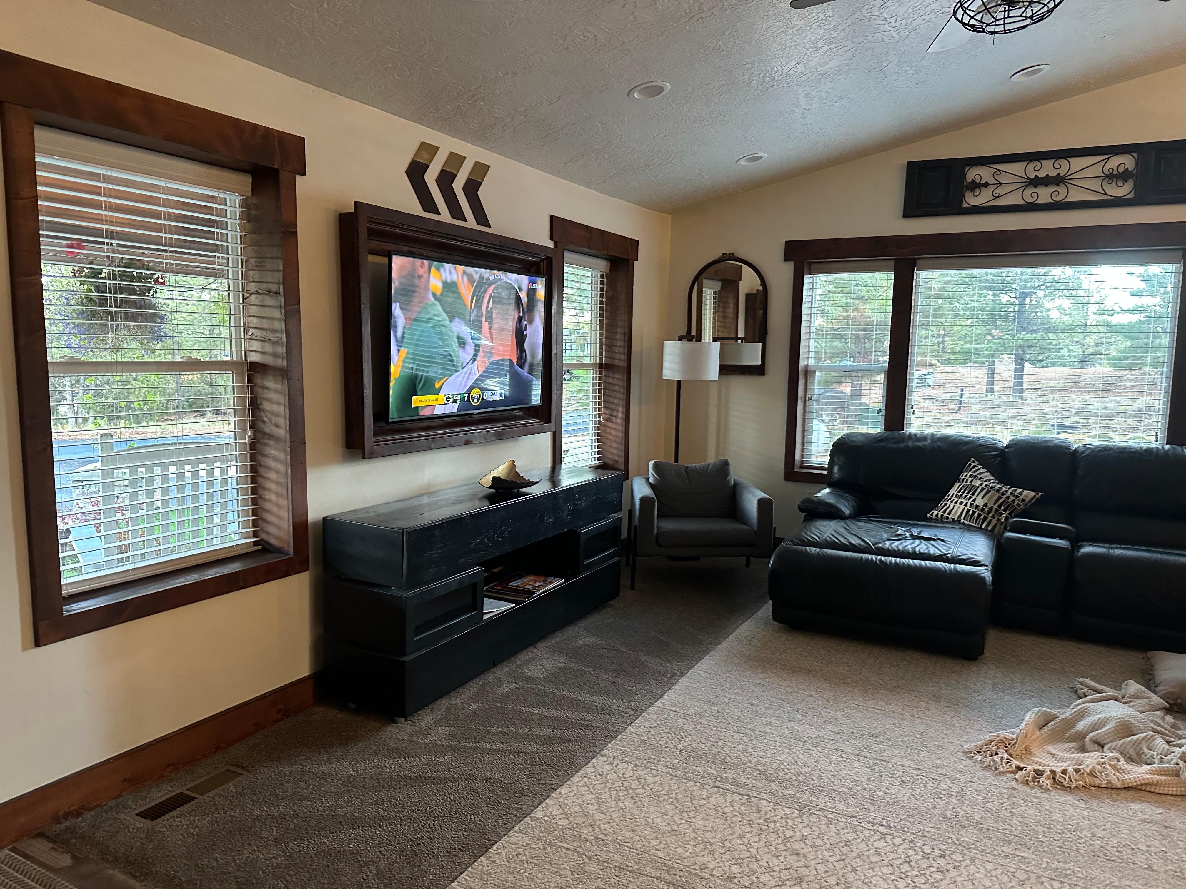 INDOOR LIVING: Smart TV, fireplace (wood not provided), breakfast bar, L-shaped sofa, ceiling fans, contemporary decor