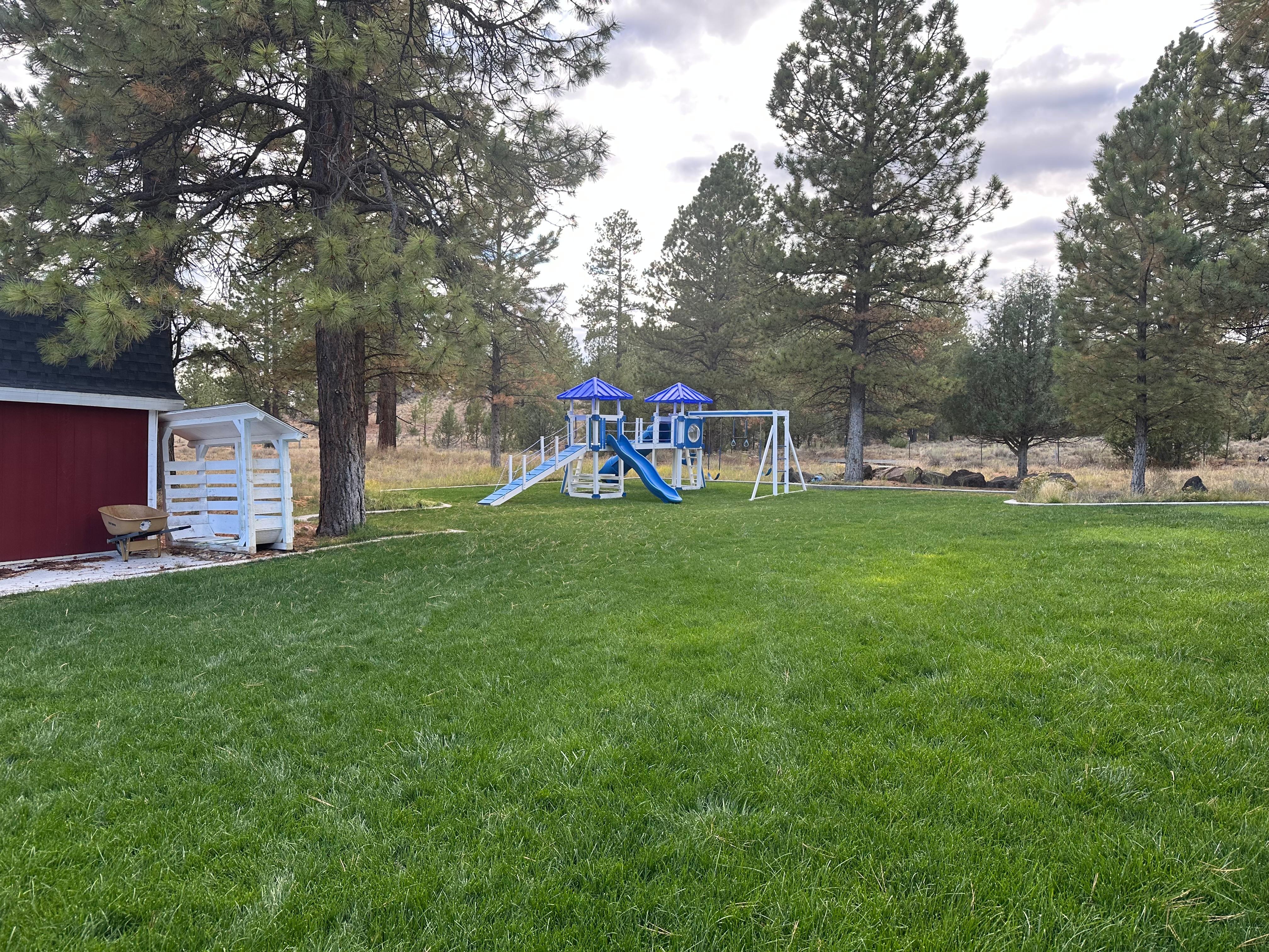 OUTDOOR LIVING: Gas grill, backyard, playhouse, playground, covered patio, foliage, scenery