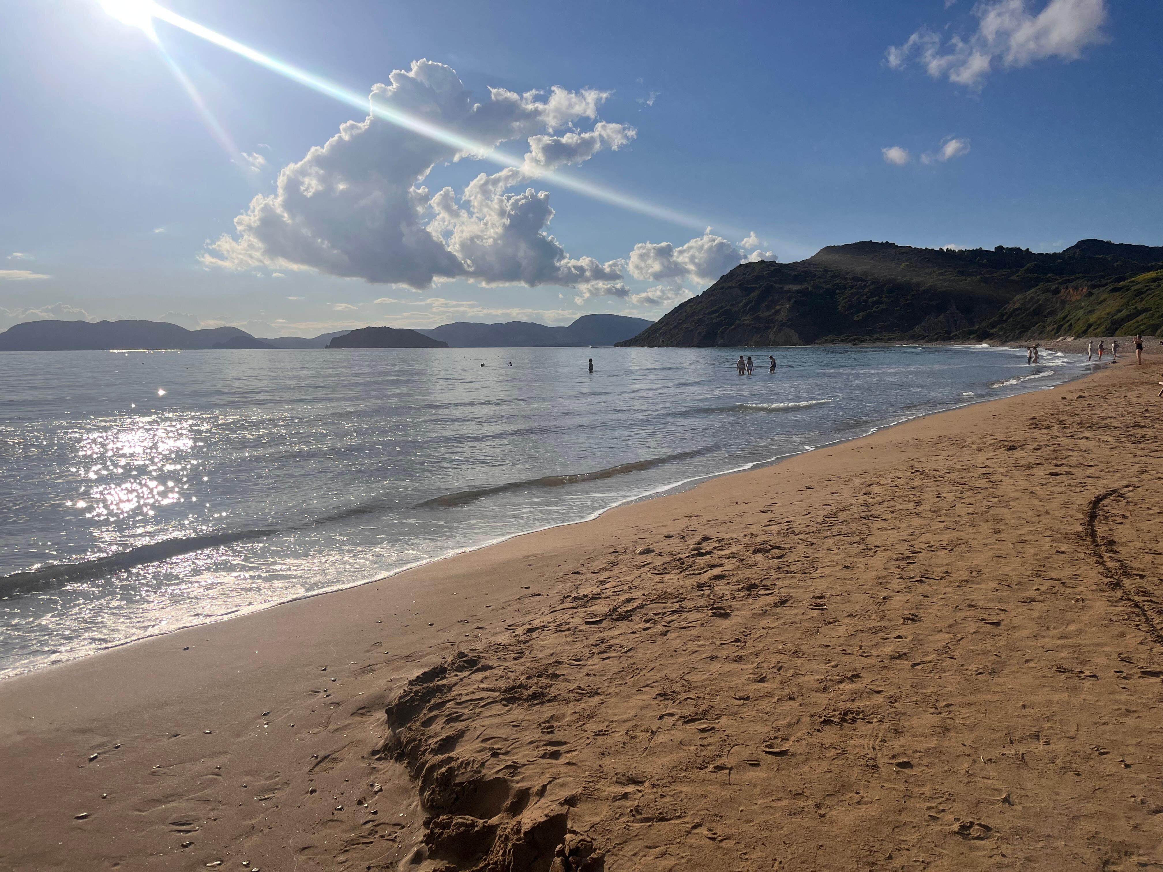 It is one of the rare points in Zakynthos with a front seaview to Marathonissi Island, where loggerhead turtle Caretta-Caretta lays the eggs. If you rent boat, you can get there and enjoy the sunshine on one of the best beaches on Zante island.