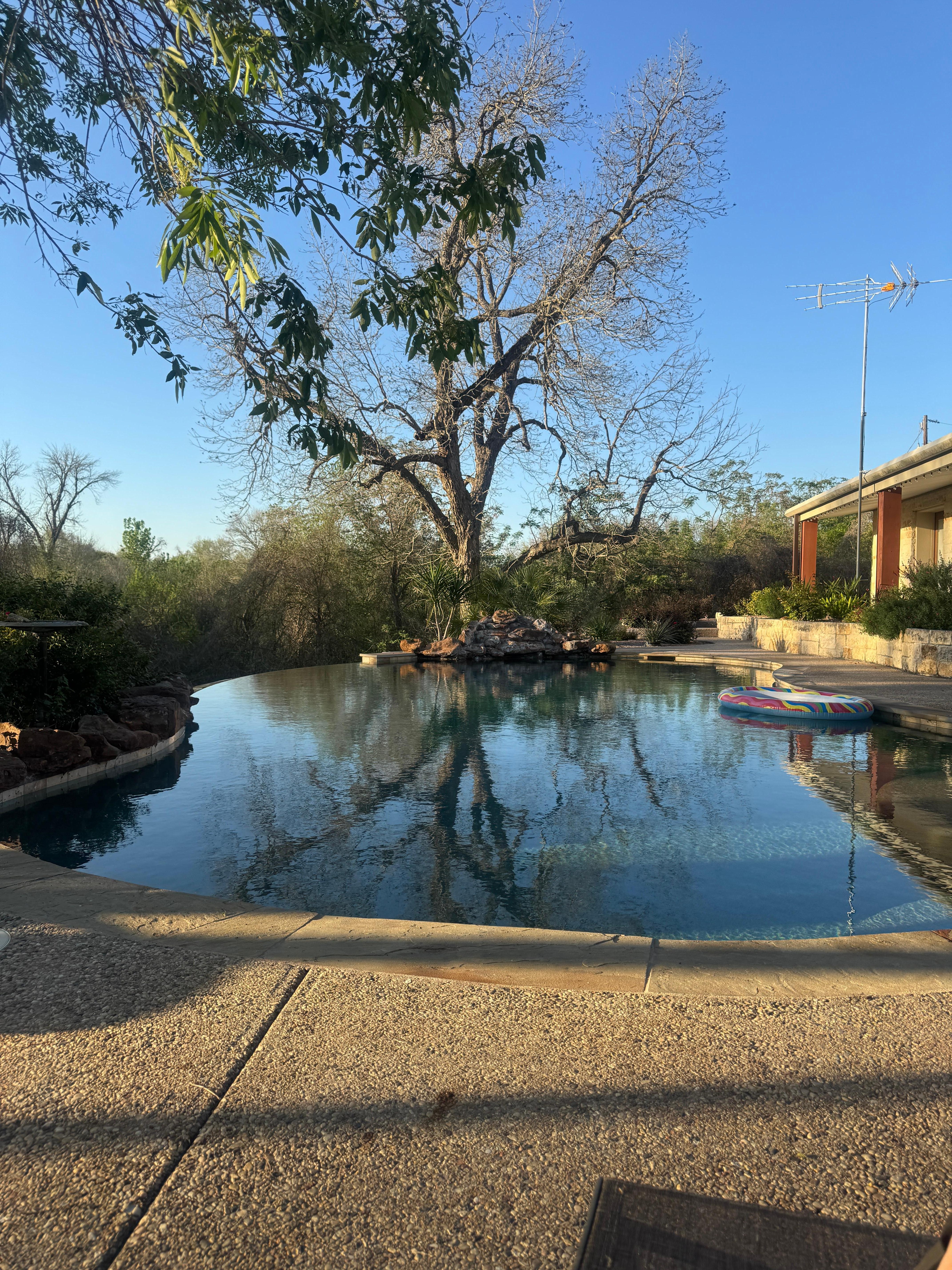 Beautiful private stone ranch style home on 10 acres on the Colorado River. Boating, paddling, fishing, weddings or just good ole relaxation. Pool surrounded by beautiful rose garden. Good vantage point for the Round Top antique festival, Fayette county Fair or Fayette Lake. Large patio with ample furniture, fire pit and charcoal or wood bar-b-que pit/smoker. Large dining room and kitchen for entertaining. Large living room with large screen TV. Internet. Wood burning fireplace. Master bedroom with private French doors opening on pool and beautiful view of lawn to river. Master BR has large private bathroom with walk In shower and double vanity. Has utility room with 2nd freezer and washer/dryer.