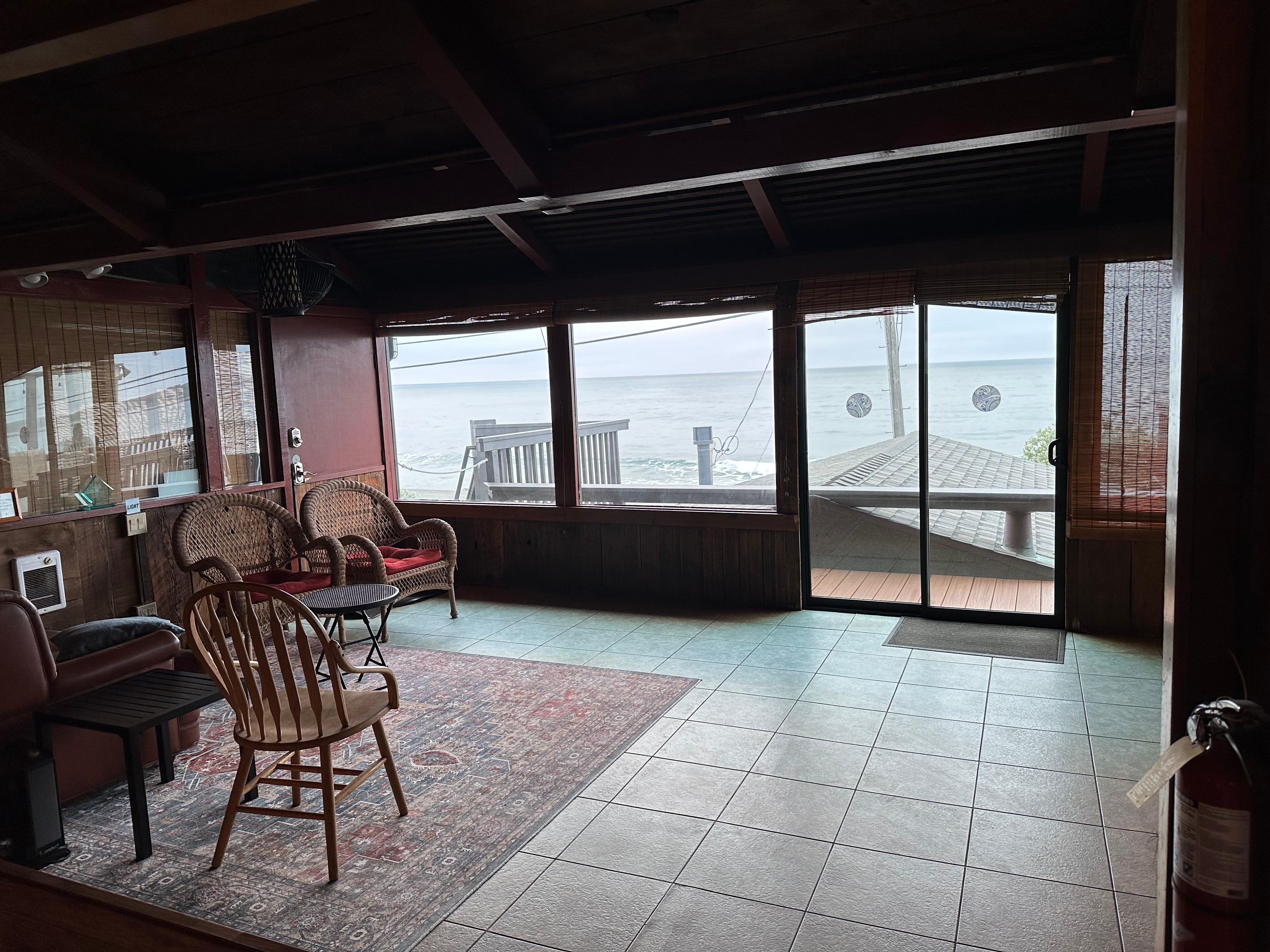 A staircase from the bottom bedroom level leads up to a large open floor living space which includes a newly remodeled kitchen with stainless steel appliances, a dining area and an entertainment area. Enjoy the spectacular views from anywhere upstairs. Additionally there are two smaller room/areas leading to the deck. One can be used as a nice cozy spot to sit and read, work on your computer (internet included) or just take in the view. The other room is an enclosed patio with a large wooden bar built in the 1950s and for kicking back with a drink in your bathing suit, weather permitting. Both of these room/areas have sliding glass doors to the deck that lead directly downstairs to the oceanfront road. The deck is a great place to catch some rays, whale watch or enjoy one of our stunning California coastal sunsets. There is plenty of parking and you also have one covered carport area for a vehicle as well.