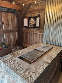 * Outdoor Living Area: Love seat & arm chair facing the open meadow, kitchenette, bbq pit and dart board all covered and protected from weather