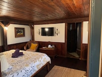 * Bedroom 1: King bed with memory foam mattress, 100% cotton bedding, en suite bathroom with shower. Minisplit a/c & heat. Smart TV. Hightop table/work space