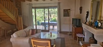 On the ground floor: large living room with kitchenette equipped with high-end, oven, dishwasher, microwave. Open fireplace + stove in season, television, DVD player, internet access, stereo (radio, CD, USB, MP3, ipod). Cloakroom / utility room with washing machine.