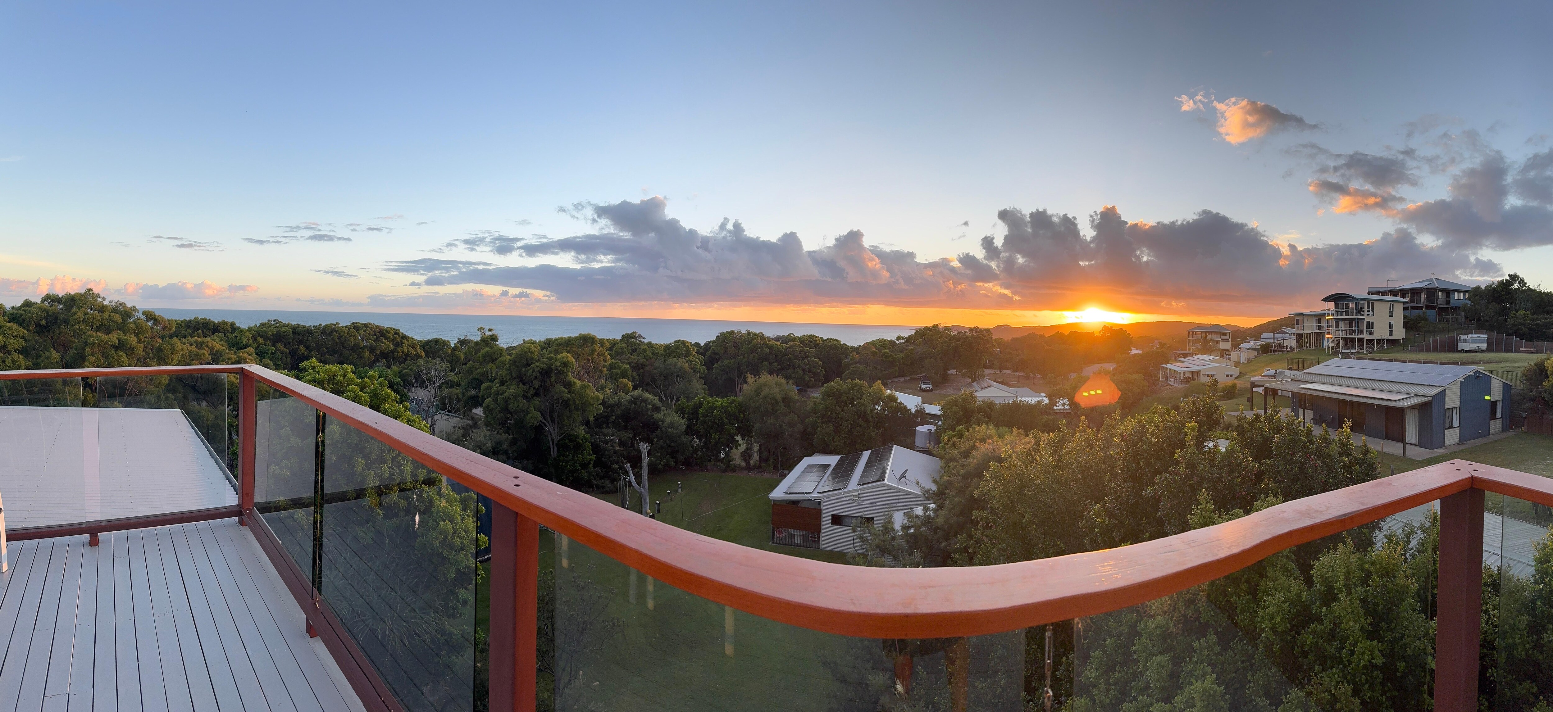 Orchid Beach is a small village in the quiet north-east of World Heritage listed Fraser Island. It has fewer visitors than the busy southern end of the Island and is situated on the eastern beach just north of beautiful Waddy Point. Wanyari accommodates up to 8 guests including children. The house was completed early 2007 and has a relaxed, contemporary feel with living over 2 levels. Downstairs are 3 bedrooms (2 with queen beds and one with 4 singles), a bathroom, separate toilet, laundry, large TV / rumpus room and huge deck. Upstairs is open plan with a large, well-appointed kitchen with stainless steel work bench, dining area and leather lounge. The master bedroom is on this level with ensuite and separate toilet. All the windows from this level have spectacular views of the ocean, beach, sand blows, Waddy Point or bush. There is a large deck on this level with a spiral staircase that leads up to our roof-top viewing deck with some of the best ocean views on the Island from Waddy Point to Sandy Cape. Great for whale watching during the humpback migration between July and September, or just for sitting quietly at the end of the day with a drink. The house has been designed to be sensitive to the environment and runs on 24 hour solar power, gas appliances and beautiful Fraser Island water. There is a gas BBQ on the middle deck, a traditional wood BBQ for cooking all those mud or spanner crabs, pippies and a fish cleaning table on the property. There is plenty of room for parking 4WDs and boats. We provide 2 complimentary kayaks for guest use, Our grounds have many bird attracting native shrubs & manicured lawn. A uniquely beautiful destination where you can be as adventurous or as relaxed as you please.