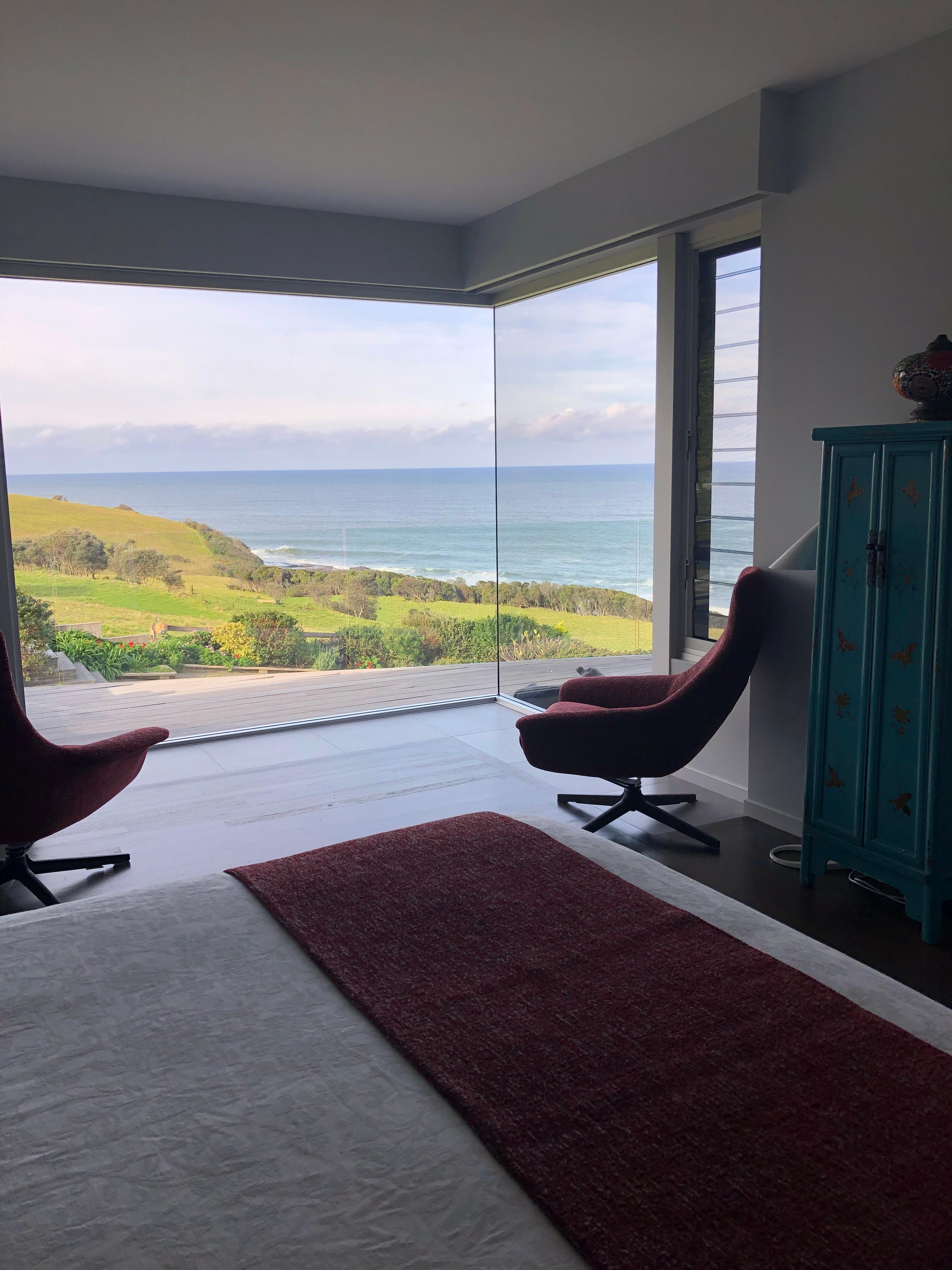 The downstairs 4th bedroom /sitting room is separated from bedroom 2 by floor to ceiling frosted glass doors. Guests staying in this bedroom share either the ensuites in bedroom 2 or 3. This area has 2 single beds 2 recliner chairs and a daybed and kitchenette all of which have a magnificent view over the farm and ocean.