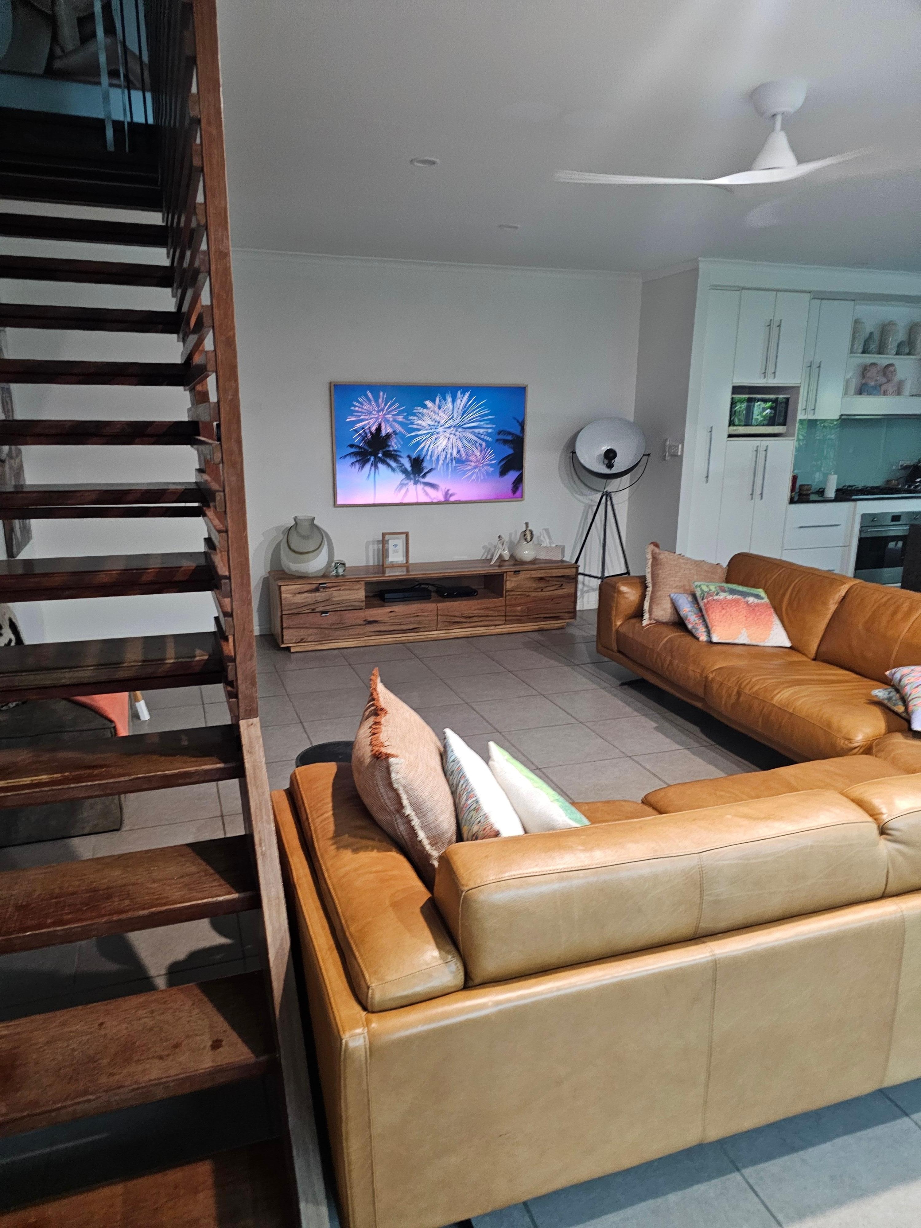 50" TV/DVD player down stairs open plan living, dining kitchen