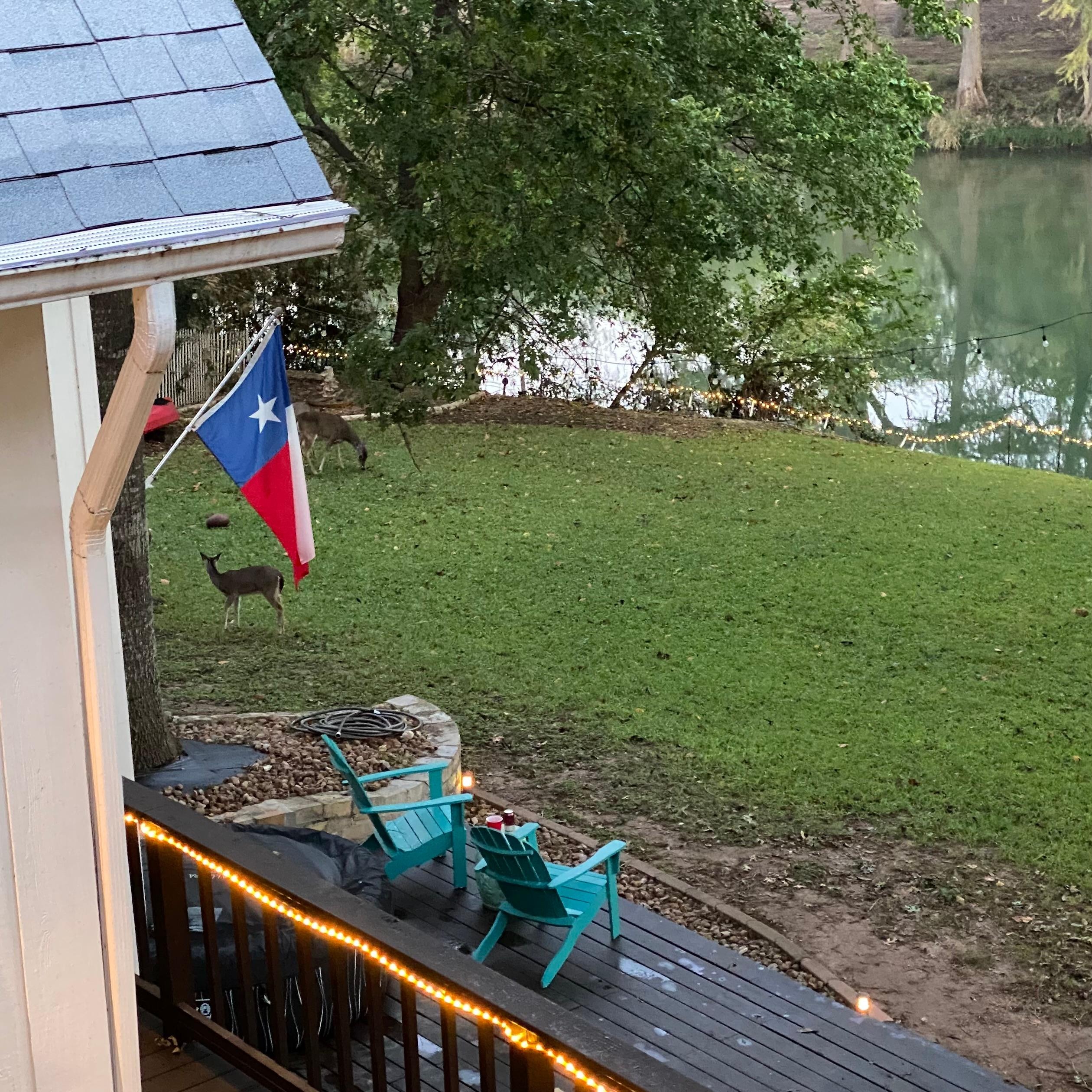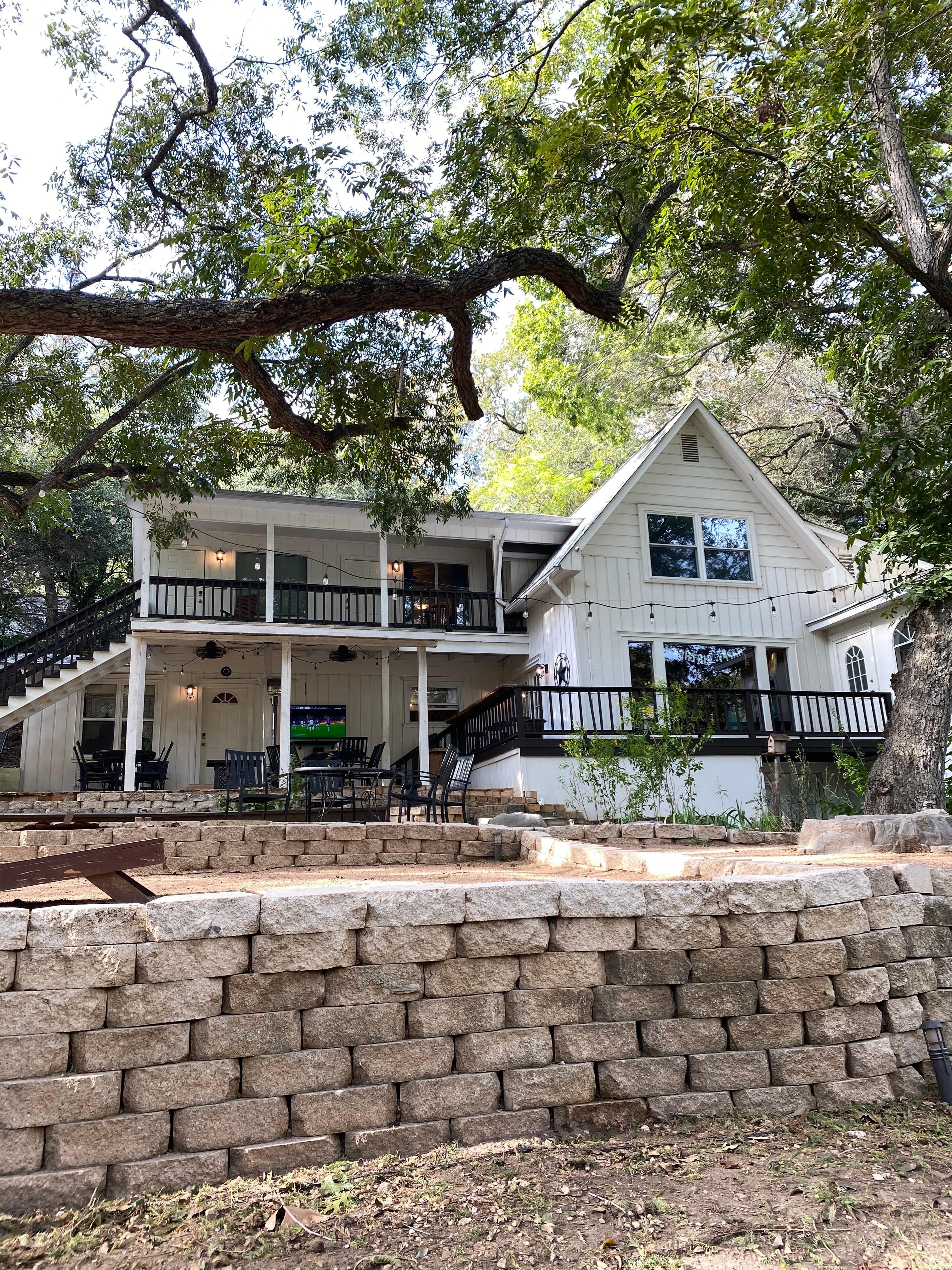 The Gruene River Haven sleeps 22 and is a fantastic location to experience all that the New Braunfels and Gruene area have to offer. Situated directly on the Guadalupe River with 150 feet of river frontage it is the perfect location for family reunions, corporate events, small intimate weddings or any group gathering. Along the riverfront there are huge ancient cypress trees towering over a private floating river dock perfect for toobing, kayaking, or fishing. The grounds consist of covered and shaded patios surrounded by large pecan and oak trees, a large fire pit area and a lush green lawn leading down to the river. On the patio there is a 55" large screen outdoor smart TV, bluetooth enabled sound bar, propane fired BBQ grill, charcoal/wood smoker, propane fired fire table, hot weather outdoor fan and a cold weather propane fired patio heater. Also, there is a 12 foot long outdoor cedar plank "Star Bar" perfect for summer time toober people watching. Toobs and kayaks are available for guest use. There is a Saluspa Hot Tub on an outdoor deck available with a $20 preparation fee. The house is a cozy setting with virtually every room in the house having an amazing view of the Guadalupe River. 9 bedrooms give everyone the privacy they need while still sleeping 22 comfortably. There are smart TVs in every bedroom, living room and patio with cable. There is a dining room and breakfast dining area perfect for large holiday meals. The kitchen is fully equipped with pots, pans, utensils and cooking essentials. There is a high chair and pack n play available.