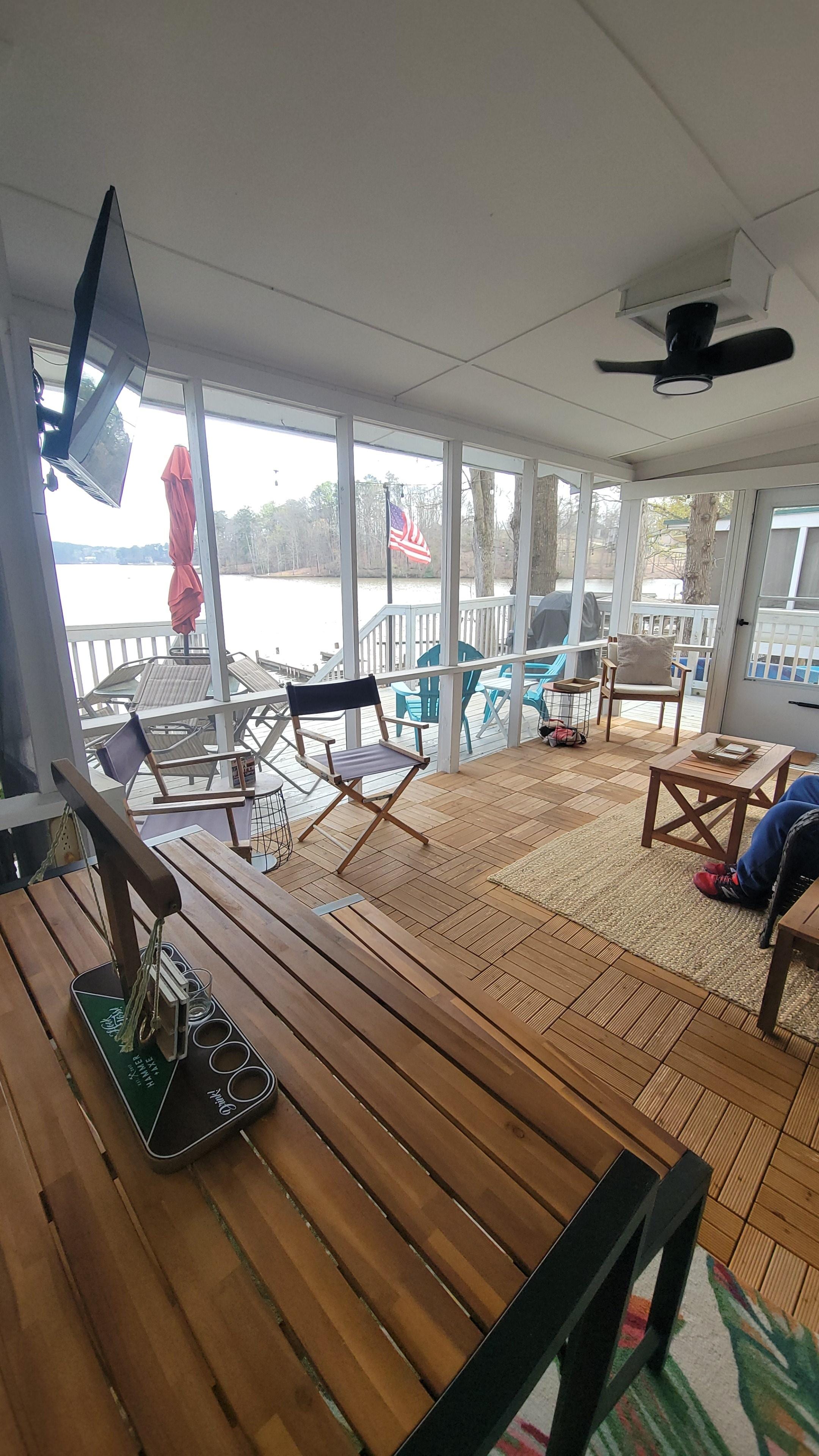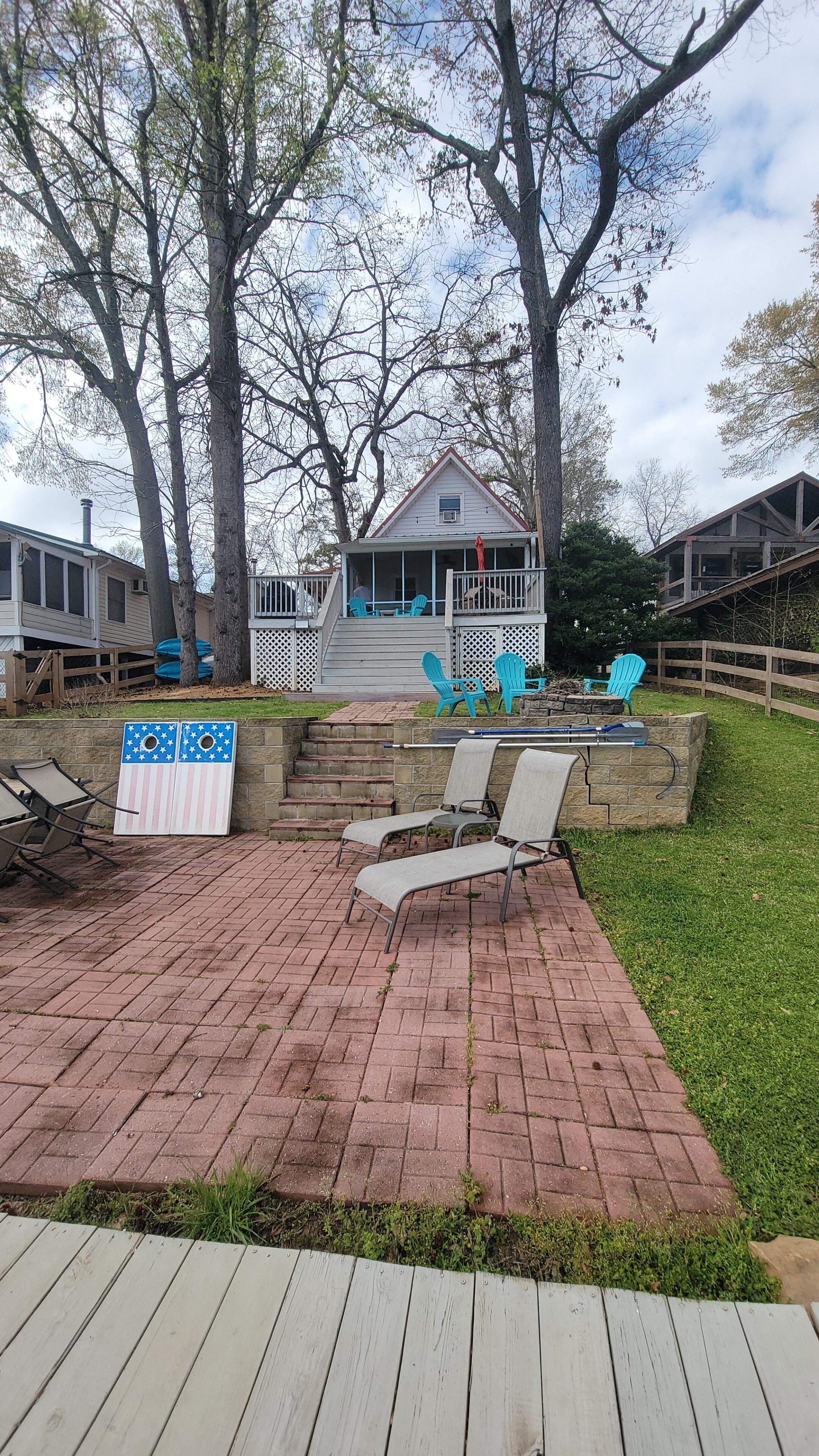 OUTDOOR LIVING: Screened-in porch, furnished deck w/ patio table, fire pit, private dock, cornhole, chaises