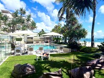 Stepping past them and into the great outdoors, a private undercover patio fenced off by a balustrade gives the luxury of choice between sinking into a sunlounger or taking a seat at the table, which is the ideal spot to serve a morning coffee, evening nightcap or anything in between. From there, it’s but a few more steps to the inviting communal pool and spa, which are surrounded by a paved relaxation zone and feed through to lush lawn that cries out for the kick of a soccer ball. Swaying palms and beachside plantings enhance the tropical ambience.