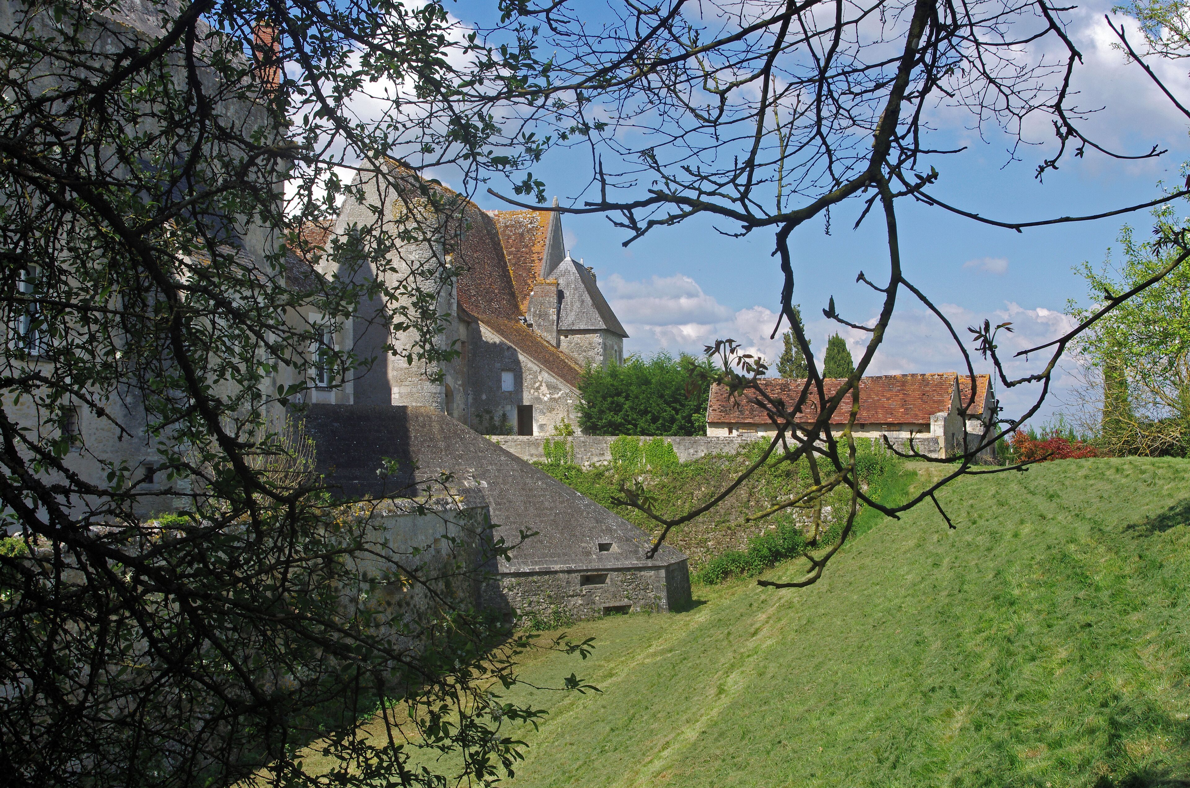 ![Bridoré (Indre-et-Loire) Bridoré is a commune in the Indre-et-Loire department in central France. Forteresse militaire médiévale (XIVe - XVe), avec son dispositif de défense en l'état et unique en France (4 caponnières*), ses étuves, bains de vapeur, tout aussi exceptionnels, ses douves, son donjon, haut de 30 mètres. Medieval military fort (XIVth - XVth centuries), with fully preserved defences which are unique in France (4 caponniers), kilns, steam baths and the exceptional moat and 100ft-tall keep. A proximité de la frontière avec le Berry, le château de Bridoré renferme des vestiges qui remontent à la fin du Moyen Age et la dynastie des Valois. Le château a été bâti au 14eme/15eme siècle pour Jean Ier Le Meingre dit Boucicaut (1310-1368), Maréchal de France et lieutenant-général de la Touraine (1310-1368), sous Charles V; puis pour son fils, Jean II Le Meingre dit Boucicaut (1366-1421), également Maréchal de France à l'époque de la Guerre de Cent Ans et compagnon de Du Guesclin, sous Charles VI. Un Boucicaut, seigneur du Breuildoré ou Bridoré, serait l'auteur d'une "bergerette" : Assés ne me puis merveiller Qu'aucuns amoureux ont créance D'estre de ceulx de l'observance, Mais plus n'y veullent travaillier. Je di qu'il leur vausist trop mieulx Plus large règle avoir choisie ; Car servir jeunes, et puis vieux Lesser tout, c'est ypocrisie. Aultre nom leur convient baillier, C'est appostatz, qui pour doubtance D'avoir ung pou de pénitence Ont voulu Leauté soillier; Assés ne m'en puis [merveillier.] Cette oeuvre figure parmi les manuscrits de Charles d'Orléans sous le nom de Boucicaut. Il s'agit probablement de Louis Boucicaut , "que nous voyons en 1475 vendre, et par conséquent posséder, la terre du Breuildoré". (Rondeaux et autres poésies du XVe siècle d'après le manuscrit de la bibuothèque nationale par Gaston RAYNAUD - 1886) Le château est donc racheté, vers 1475, par Imbert de Batarnay, seigneur du Bouchage, conseiller et chambellan à la cour royale. Mort à 82 ans, Imbert de Bastarnay a officié sous les règnes de quatre têtes couronnées de Louis XI à François 1er. C'est lui qui crée les caponnières; au passage , il réhausse le donjon et le couvre d'un toit. François 1er aurait été reçu au château où Jeanne d'Arc serait également venue. Son fils René de Bastarnay (1513-1580), gouverneur du Mont Saint Michel, remet à niveau les défenses du château au début des Guerres de Religion. En 1641, le château est racheté par le marquis Charles de Viantais* (Ses filles* fondent, à Beaulieu-lès-Loches, le couvent des "Viantaises"*). La propriété de Bridoré restera dans la famille Viantais jusqu’à la Révolution. "Messire Pierre de Boursault, chevallier seigneur marquis de Viantais, a pris possession réelle et actuelle de la terre du Bridoré, érigée par Sa Majesté en tiltre de marquisat soubz le nom de Viantais en Tourainne, laquelle luy a est dellaissée en faveur de mariage par Messire Charles de Boursault, chevallier seigneur de Viantais, son père ; le tout en la présance de monseigneur son père, lequel luy a remis entre les mains les clefz de ladite maison nottamant celles du Trésor où sont les tiltres, pappiers et anseignemans des droits de ladite terre et celles de la Roche, Rangé et autres y annexées, 29 septembre 1651 (acte Chartier-Bridoré)." A la révolution, le château est vendu comme bien national. Il restera dans la même famille jusqu'à aujourd'hui. Les caponnières, ancêtres du blockhaus, inspireront Vauban. Le château de Bridoré est un des rares sites à en disposer. Le château-fort, est protégé par des douves, et doté de caponnières (moineaux) aux angles. Le dispositif permet de s'opposer aux tentatives d'attaques de bandes armées car il n'y a pas d'angle mort. Une note d'un rapport au Roi sur la province de Touraine (Charles Colbert de Croissy - 1664) nous informe que "Cette famille se nommait Boursault de Viantais. Catherine Boursault de Viantais était religieuse aux Véroniques de Blois , et en sortit pour venir fonder à Beaulieu près Loches , une maison de chanoinesses régulières , de l'ordre de Saint -Augustin. Elle vivait encore lorsque la révolution a détruit cette abbaye et affecté son enclos à la création d'une péipinière. Ce couvent fut le dernier propriétaire du château de Bridoré, fief de la famille Boursault de Viantais. En 1643 le couvent est fondé à Beaulieu par Catherine-Angélique de Boursault de Viantais, 24 ans, et sa jeune sœur Renée-Thérèse. Catherine-Angélique née le 7 mars 1619 à Paris, est la fille de messire Charles de Boursault marquis de Viantais, Oisay et de Bridoré, gentilhomme du roi et capitaine de régiment de cavalerie de sa Majesté et de Charlotte Viart de Vollay, originaire d’une grande famille du Blésois. Jusqu’à l’âge de 6 ans, Catherine-Angélique est élevée par la famille de sa mère puis envoyée au couvent de Bonlieu, dans la Sarthe. Novice à 14 ans, elle souhaite prononcer ses vœux deux ans après, mais, sa mère s’y oppose, préférerant qu’elle fasse son entrée dans le monde. La jeune fille ne change pas d'avis et entre dans un couvent de « Véroniques », à Blois, où la fonction de Prieure lui est promise. Finalement, elle décide de fonder son propre couvent, avec sa sœur Renée-Thérèse. Son père lui achètera alors trois bâtiments rue Brulée à Beaulieu. Le couvent s'agrandira par des jardins et un logis sur les bords du canal. Catherine-Angélique dirigera son couvent pendant 69 ans, jusqu’à sa mort le jour du Vendredi Saint 1712, à l’âge de 93 ans. La mère supérieure ayant pris beaucoup d’embonpoint, le cercueil ne pu emprunter un étroit escalier à vis. Faire passer le cercueil par la fenêtre poseait un problème canonique, on du donc obtenir l’autorisation de l’Archevêque de Tours. Le cercueil passa donc par la fenêtre et fut enterré dans la chapelle du couv